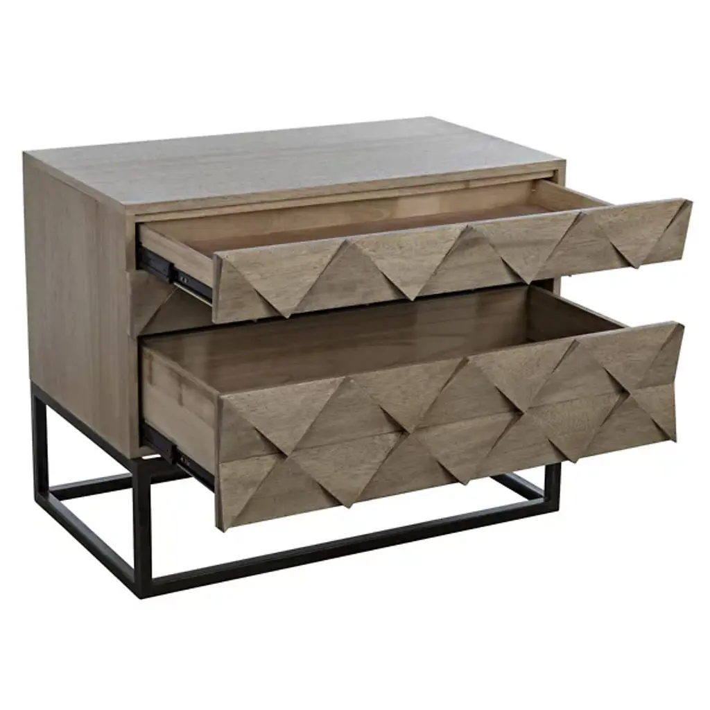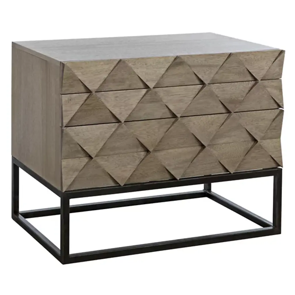 The Draco Sideboard from Noir features hand-carved diamond patterns across three drawer fronts that create geometric depth through precise triangular cuts. Each carved element catches the light differently, forming shadows that shift throughout the day and emphasize the sculptural quality of the walnut surface. The mathematical precision required to achieve consistent diamond spacing across all drawers demonstrates masterful craftsmanship. A metal base frame lifts the wooden cabinet, providing structural contrast while maintaining focus on the intricately carved details above.