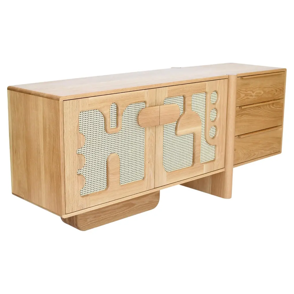 Mid-century flair and expert craftsmanship give the Dresden Sideboard a handsome form. Constructed from smoke grey oak veneer with milliken cognac faux leather on the doors for an intriguing look. Textured circular handles in solid oak wood add a global flair.