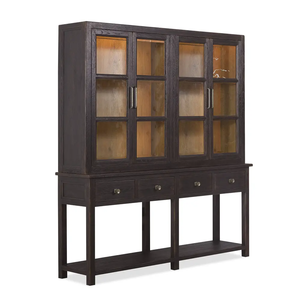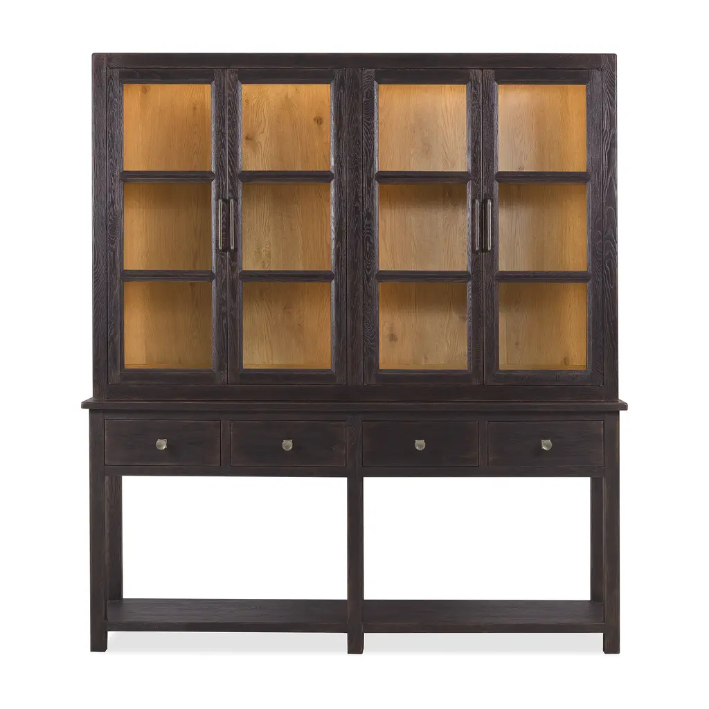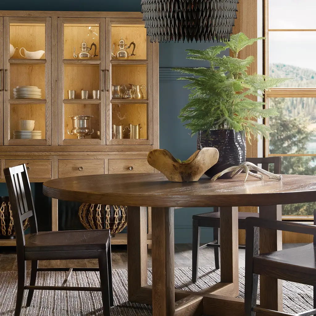 A stunning centerpiece for a rustic yet refined dining space, the Driftwood Display Sideboard from Hooker Furniture beautifully blends storage and display. Its distressed, sun-faded finish highlights the wood's natural character. Four wood-framed, seeded glass doors open to reveal adjustable shelves with plate grooves, perfect for showcasing your favorite dishware. For practical organization, four self-closing drawers, including one with a silverware tray, keep essentials neatly tucked away. Highlights: