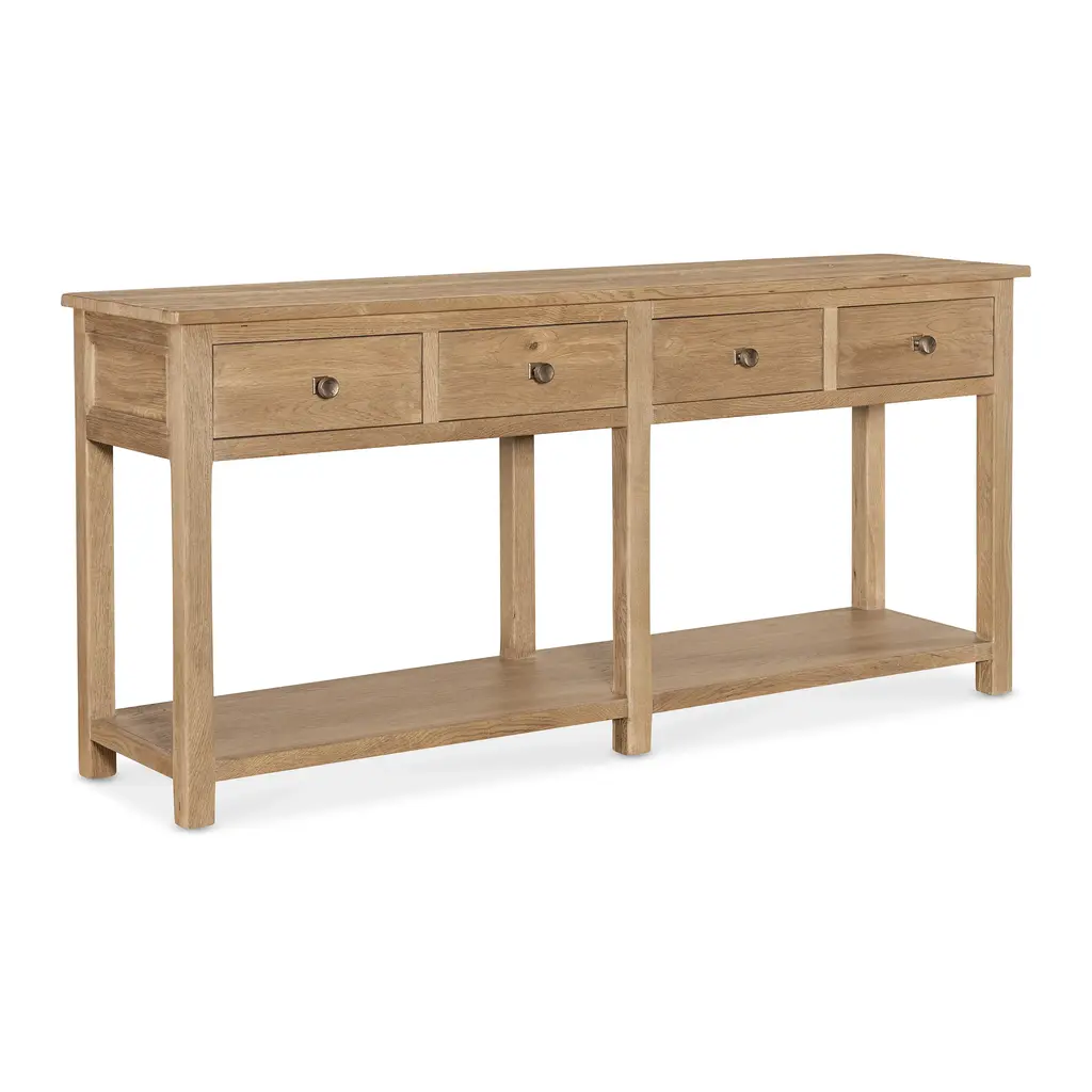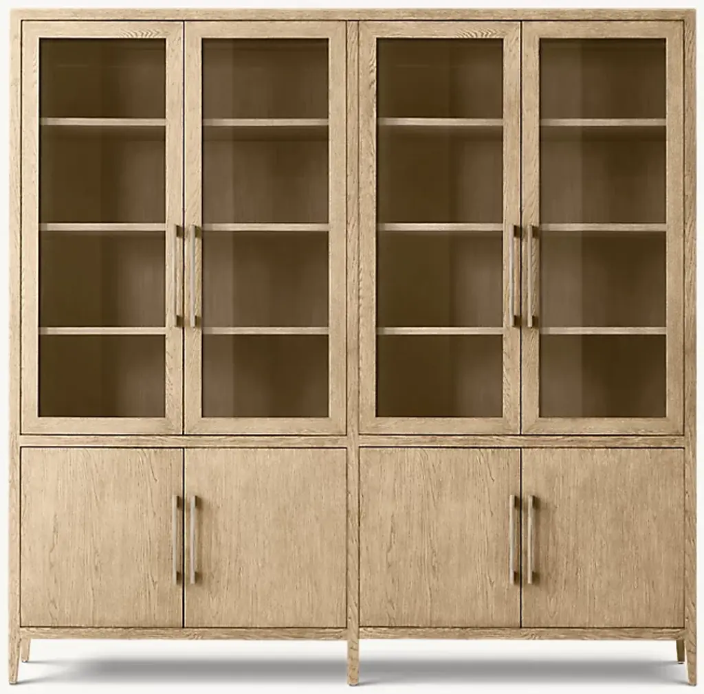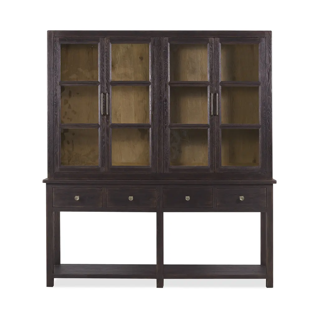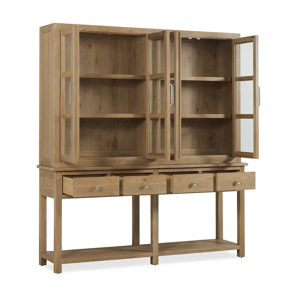 A stunning centerpiece for a rustic yet refined dining space, the Driftwood Display Sideboard from Hooker Furniture beautifully blends storage and display. Its distressed, sun-faded finish highlights the wood's natural character. Four wood-framed, seeded glass doors open to reveal adjustable shelves with plate grooves, perfect for showcasing your favorite dishware. For practical organization, four self-closing drawers, including one with a silverware tray, keep essentials neatly tucked away. Highlights: