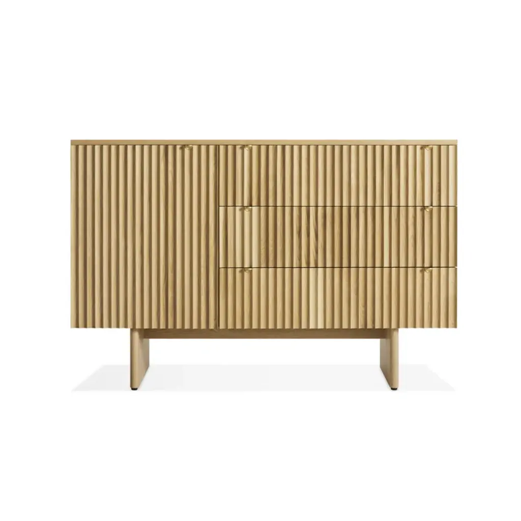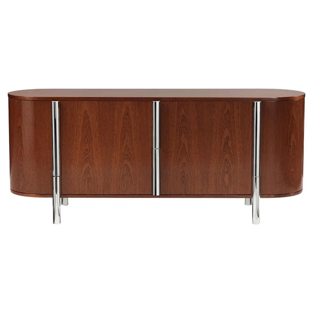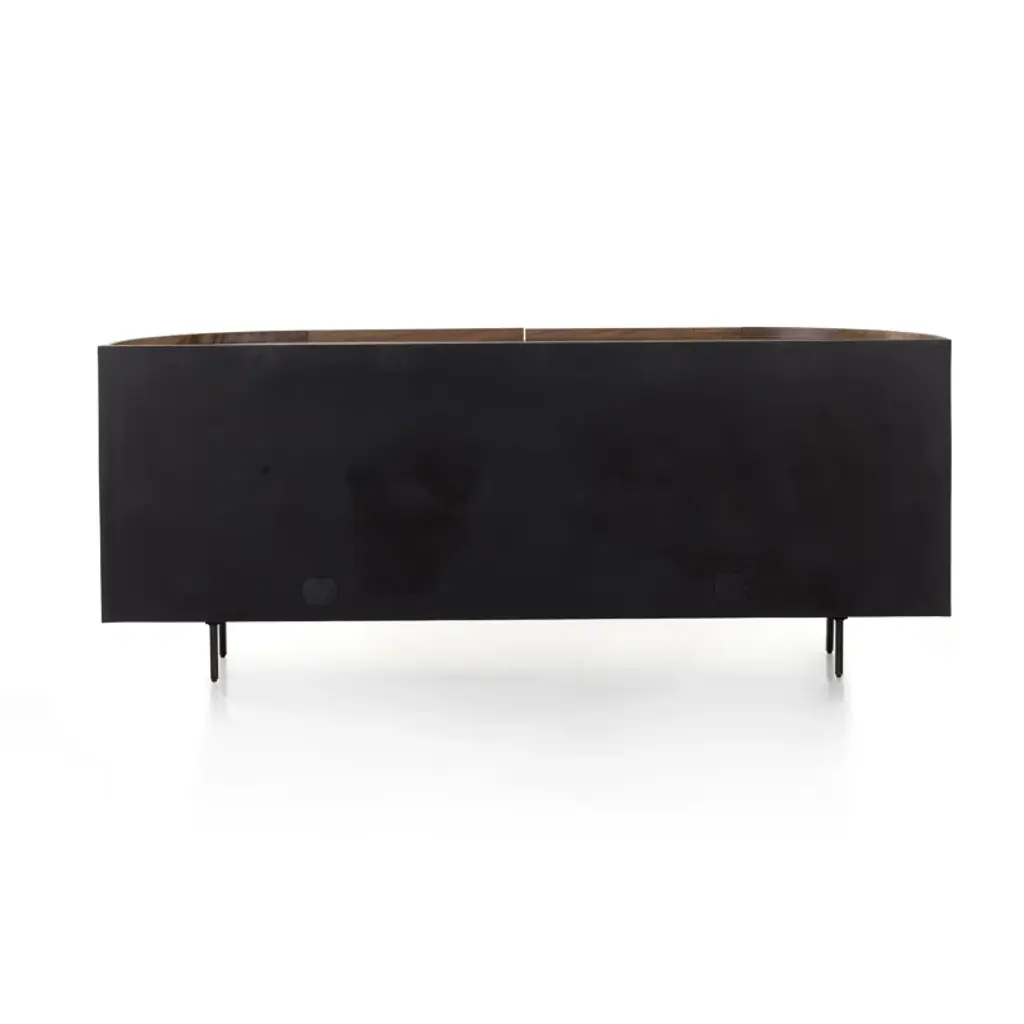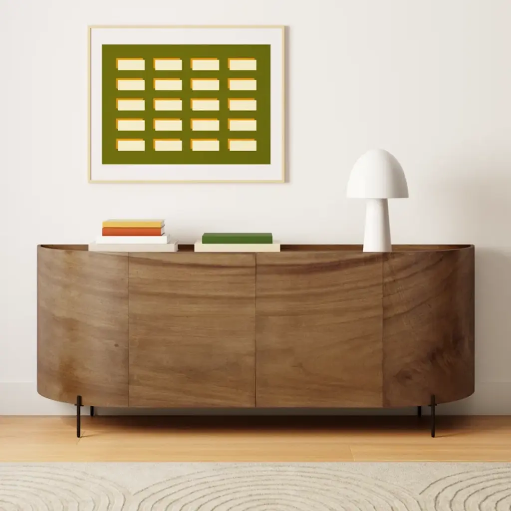 Wood grains flow smoothly across this sideboard’s half-moon silhouette and flat front doors, which open to reveal two shelved cabinets. Built from solid, sealed guanacaste wood with unique natural variations, it features an iron base + inset top inspired by fine jewelry settings.