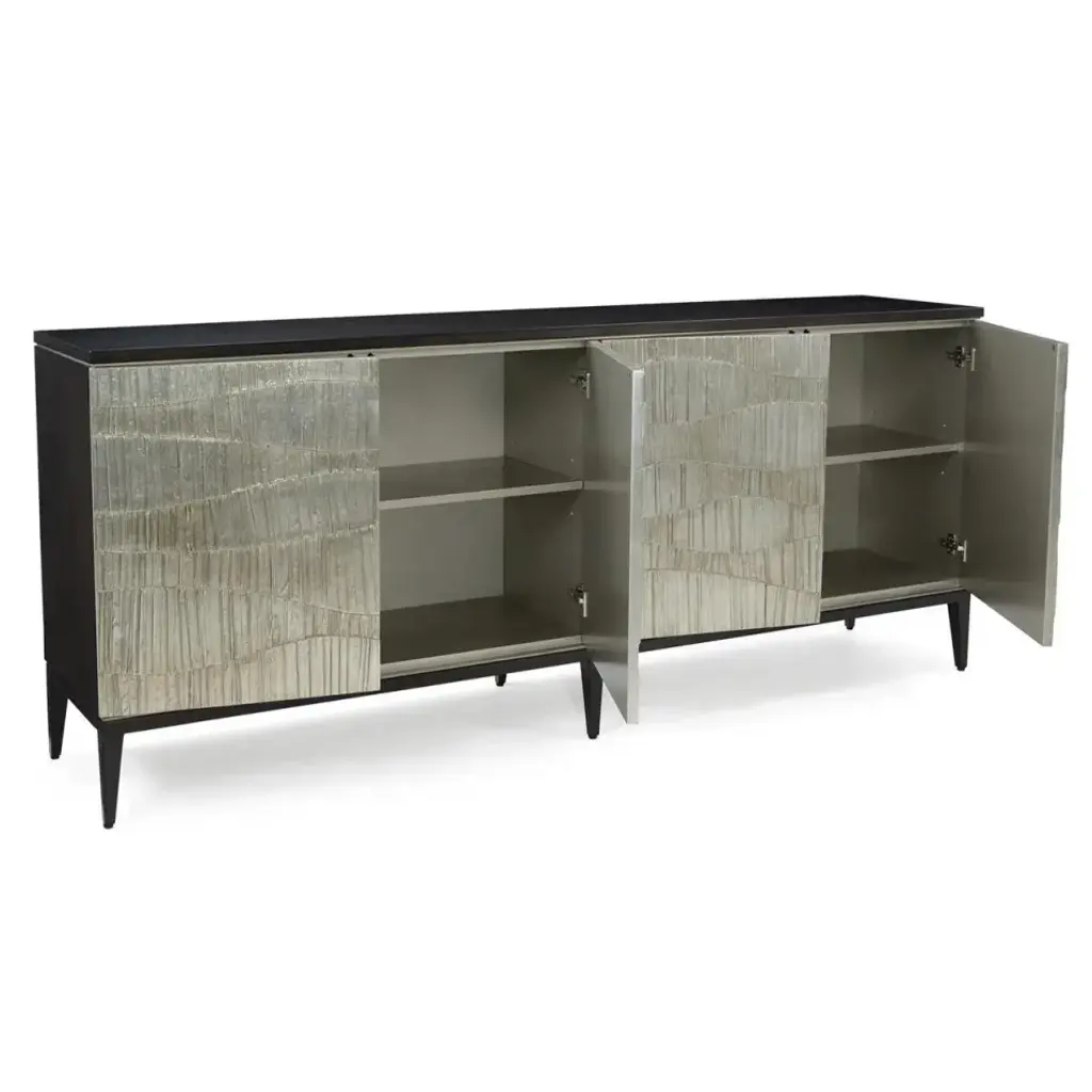 This case of this sideboard is finished in sorano brown. The door fronts showcase a wave design in silver pewter with a glaze.