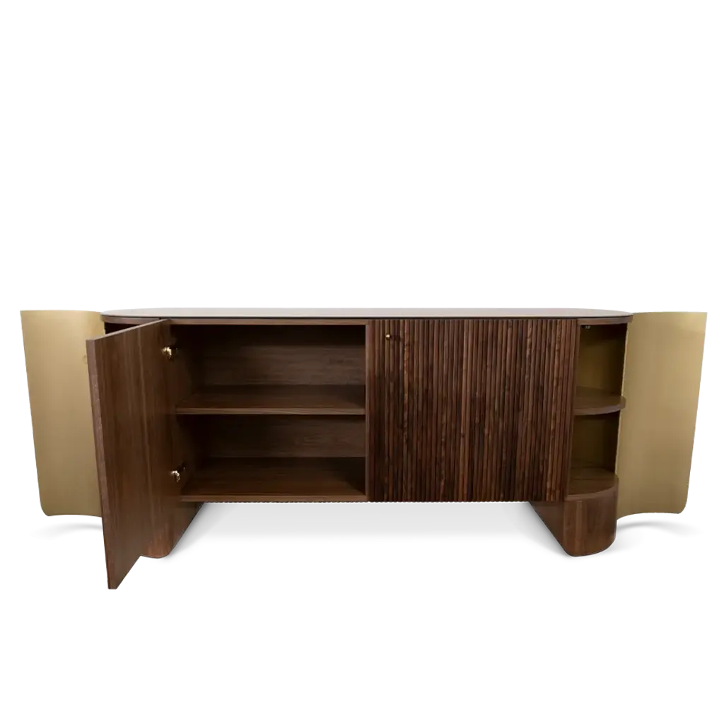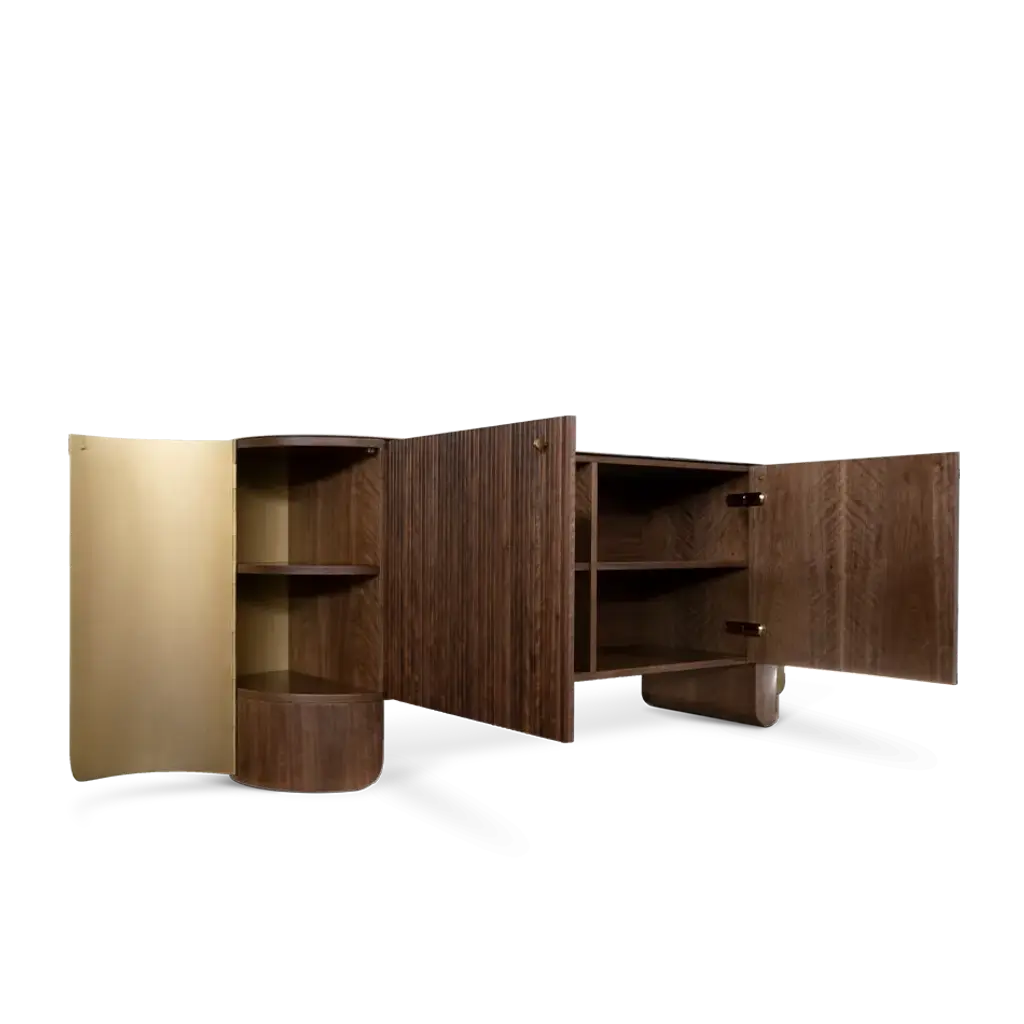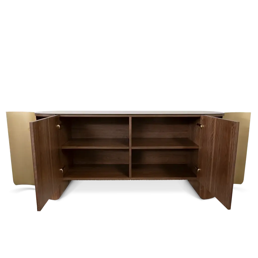 Combining the best of mid-century and Italian design excellence, the Duncan sideboard reinvents the 60s charm in a unique way. The curved lateral metal structures support and hug the body of the side doors, while the main storage space is enhanced with a geometric wooden pattern that adds another layer of texture. High-quality materials and exquisite craftsmanship make this an exceptional statement piece for any modern home design.