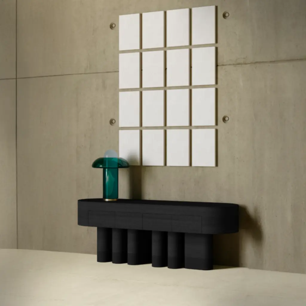 The Dylan Sideboard Black is a bold yet understated statement piece that brings an irreverent personality to your home, infusing it with pure poetry and artistic charm. The modern sideboard in black wood enhances its sculptural presence with its architectural forms, combining solid shapes with a sense of movement while maintaining its striking elegance. The deep black finish adds a layer of sophistication, making it a timeless piece that seamlessly fits into contemporary and classic interiors. Whether placed in a statement entryway or a mid-century modern dining room, the Dylan Sideboard Black transforms any space into an unforgettable visual experience. Dimensions:Width: 140 cm | 55.12 in – Depth: 40 cm | 15.75 in – Height: 80 cm | 31.5 in Materials:Body in Black Matte Wengue