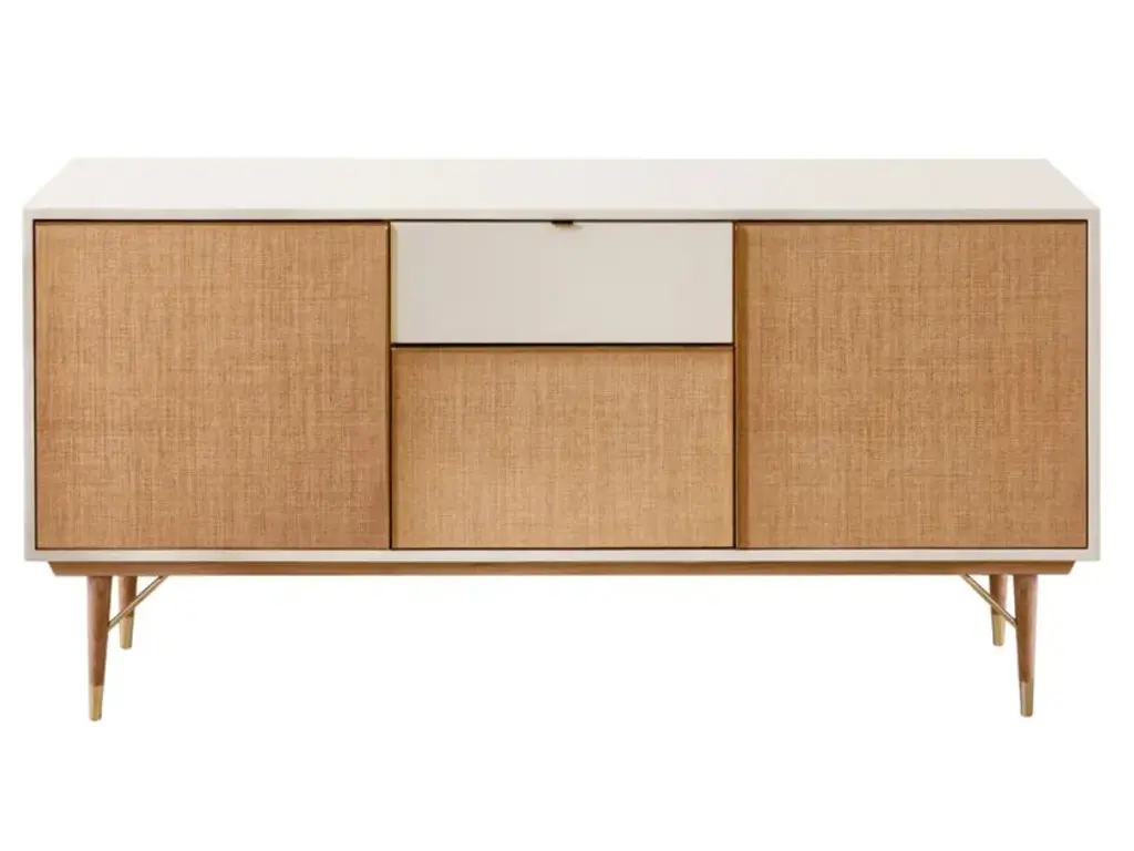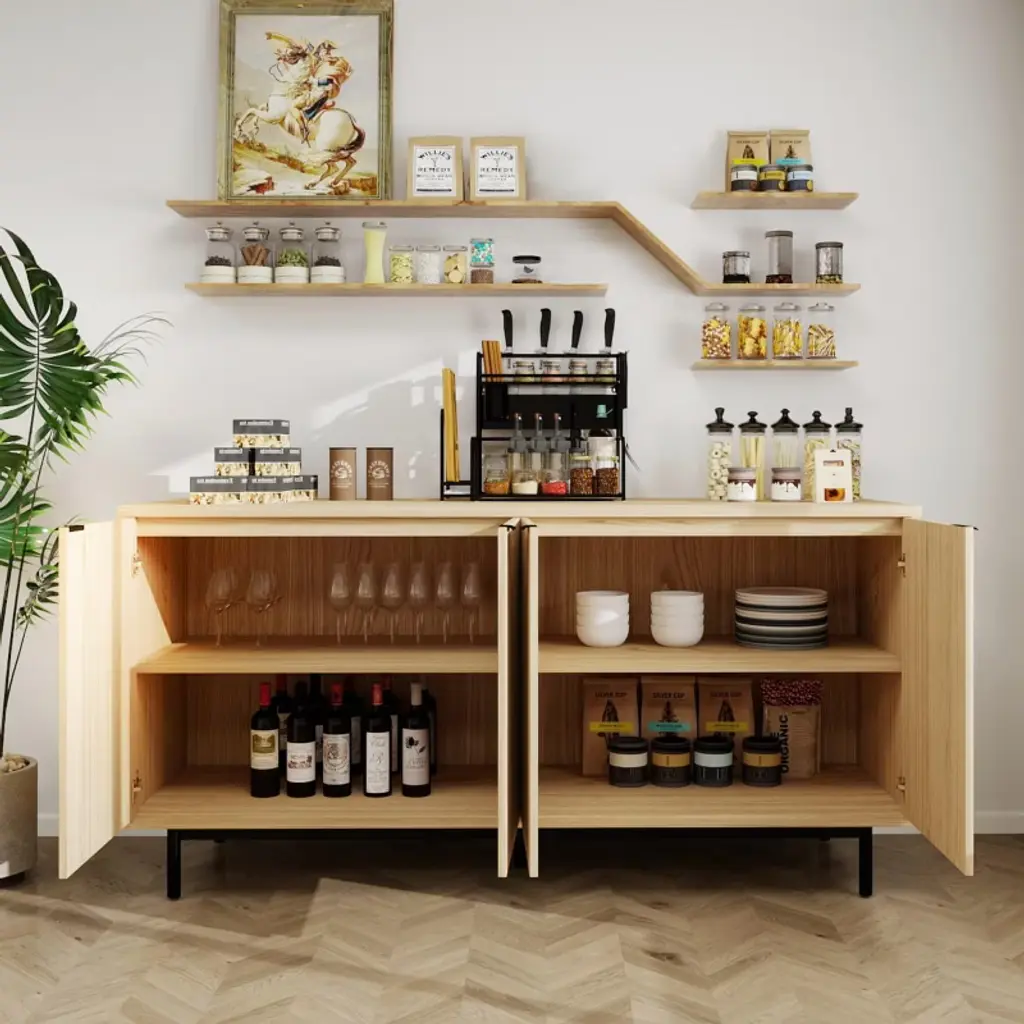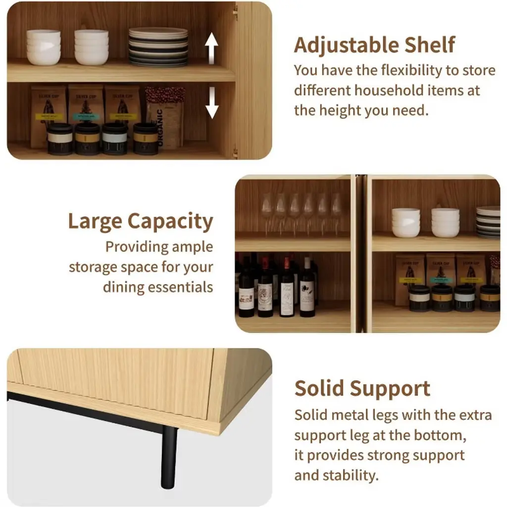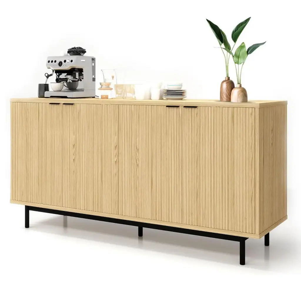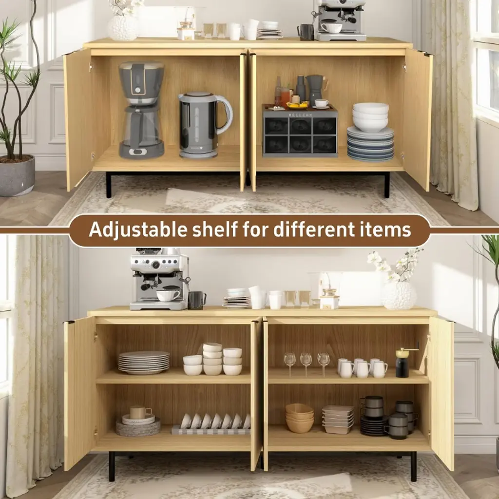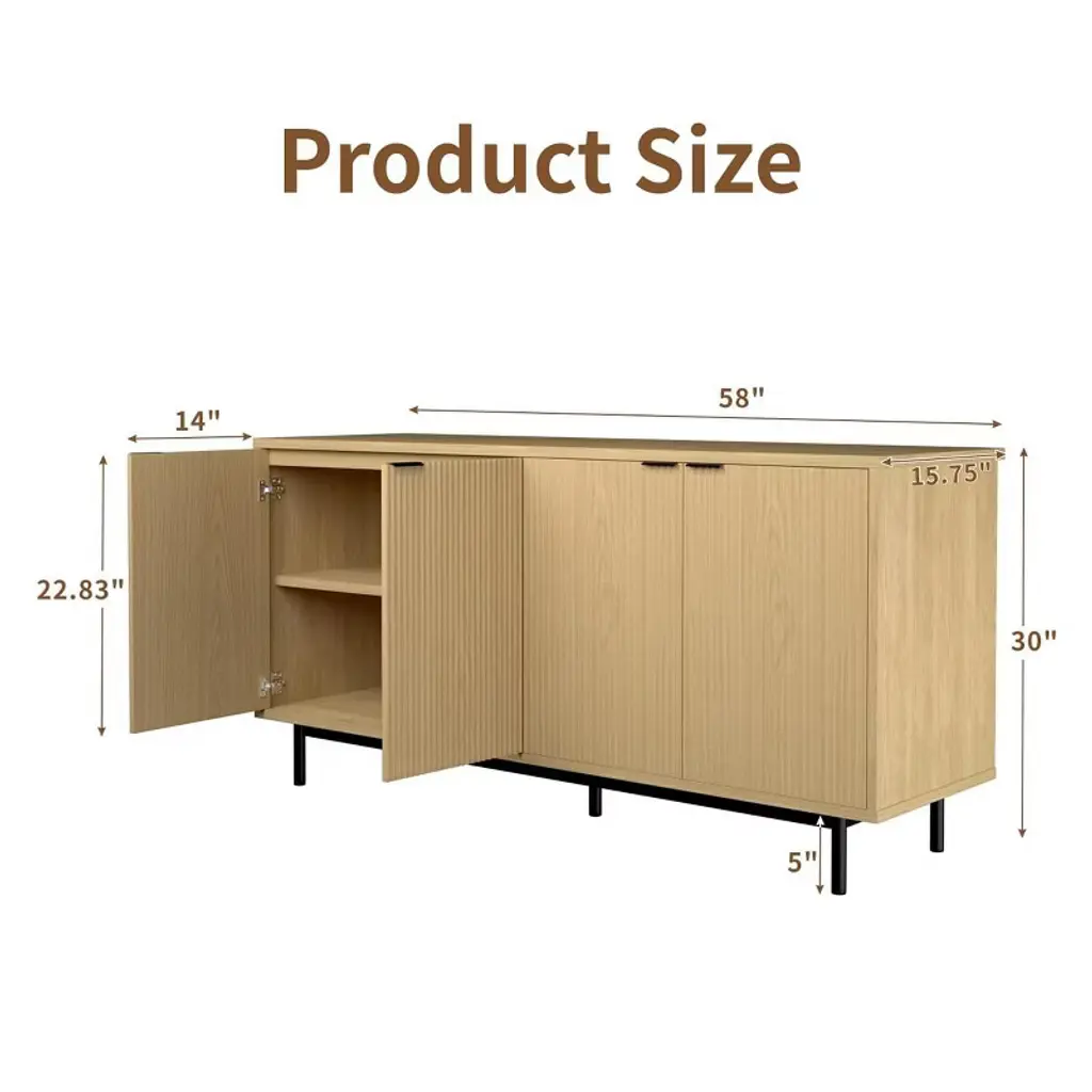 This natural-toned sideboard cabinet combines fluted detailing with 4 spacious compartments and adjustable shelves, ideal for displaying dishware or organizing kitchen essentials while doubling as a stylish coffee station on this buffet cabinet with storage. Built with reinforced wooden frames and scratch-proof finishes, the fluted sideboard maintains its sleek appearance despite daily use in high-traffic dining areas or busy living rooms, showcasing its durability as a buffet cabinet. Integrated wire management and 33" open shelf accommodate coffee machines and mugs, creating a compact beverage station perfect for small apartments or open-concept kitchens as this buffet table. Pre-drilled joints and labeled panels enable 30-minute setup without tools for this fluted cabinet, while removable base panels simplify floor cleaning beneath the 58" wide sideboard. Steel-reinforced legs support 150lbs evenly across shelves, ensuring secure storage for heavy dishware collections or small appliances in home offices or dining spaces as this buffet cabinet with storage.