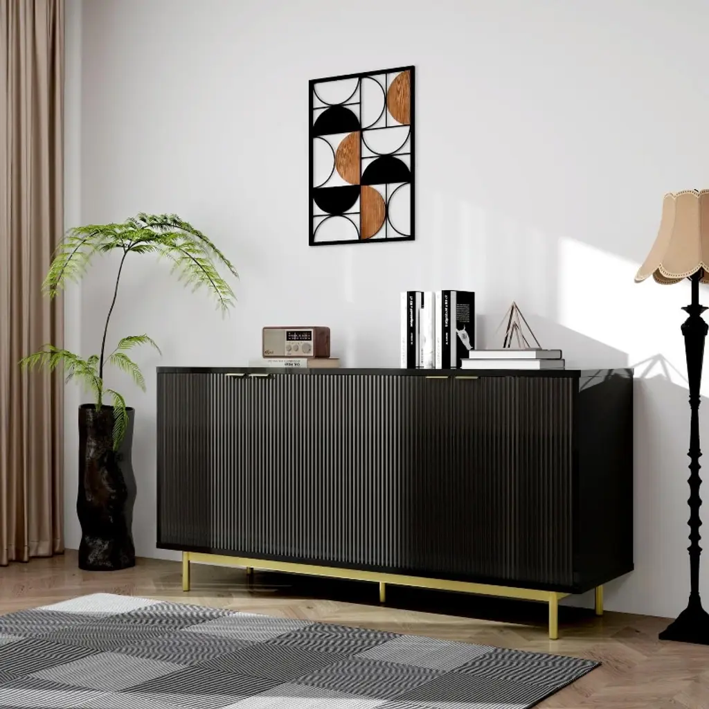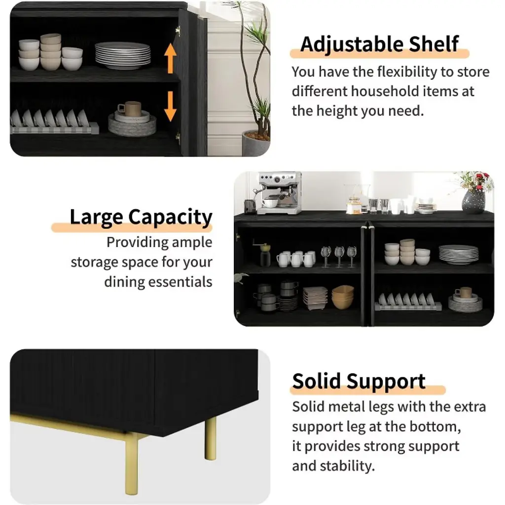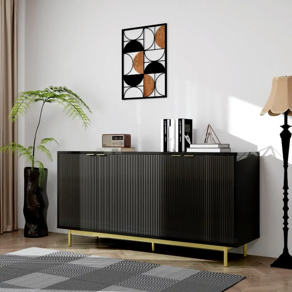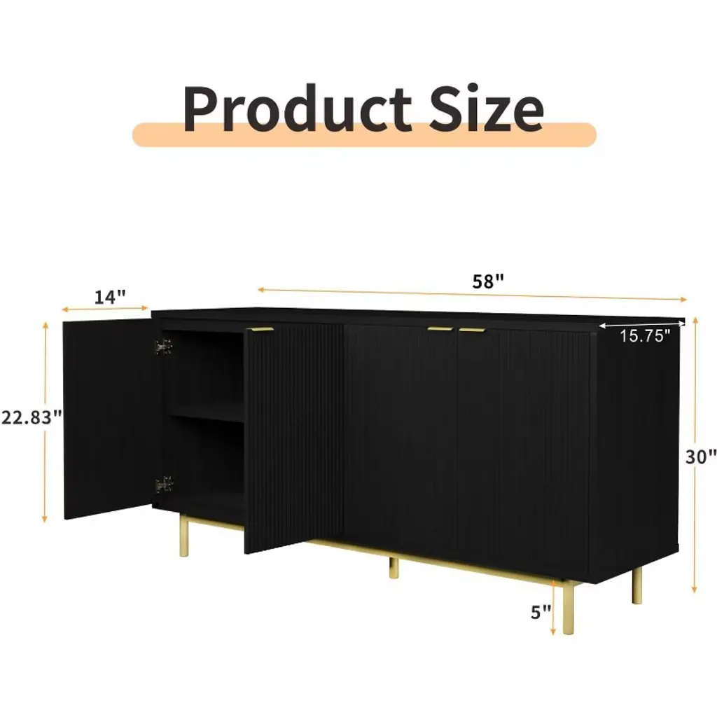 1.Spacious Storage This buffet cabinet features four doors and two adjustable shelves, offering flexible storage for tableware, daily essentials, and more. It¡¯s a versatile must-have for any home. 2.Stylish Fluted Design Elegant fluted panels paired with sleek metal handles create a modern, sophisticated aesthetic. This accent cabinet elevates home decor with contemporary craftsmanship, blending seamlessly into various interior styles. 3.Multi-Functional Use Buffet & Coffee Bar: Use the top surface for a coffee station (store mugs and machines inside), ideal for entertaining. TV Console & Display Cabinet: The 58" wide top fits up to 65" TVs, while shelves showcase wine collections or decor, adding warmth to living spaces. 4.Durable & Stable Construction High-Quality Wood Build: Eco-friendly panels resist wear and moisture for long-term use. Triple Support System: Metal main legs + central support leg ensure stability, with a 150 lbs weight capacity. Space-Saving Size: 15.75"D ¡Á 58"W ¡Á 30"H (occupies only 0.4©O), perfect for living rooms, dining areas, or entryways. 5.Easy Assembly Labeled parts and detailed instructions (with video tutorials) allow solo setup in 30 minutes¡ªno professional tools required.