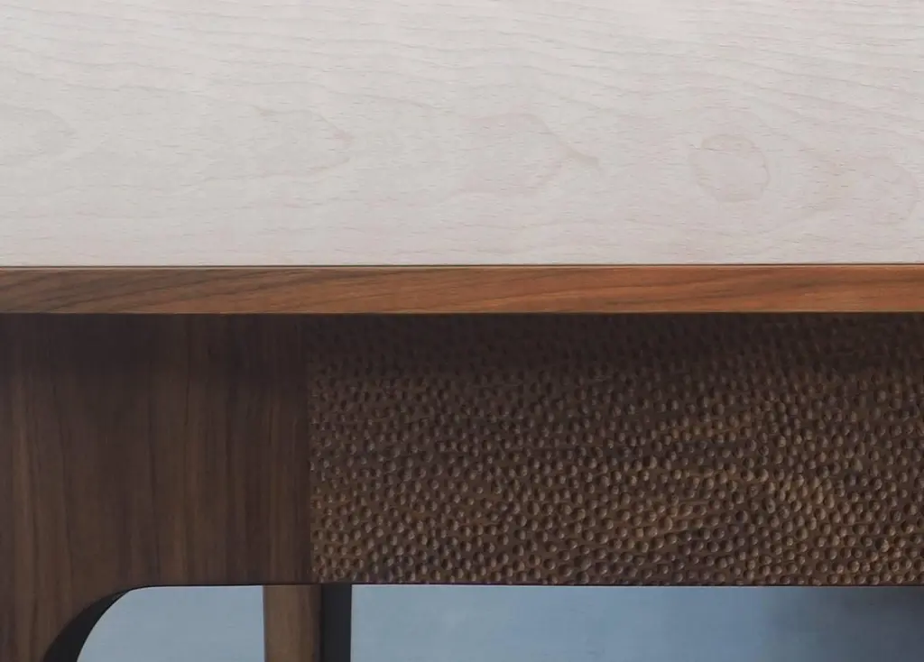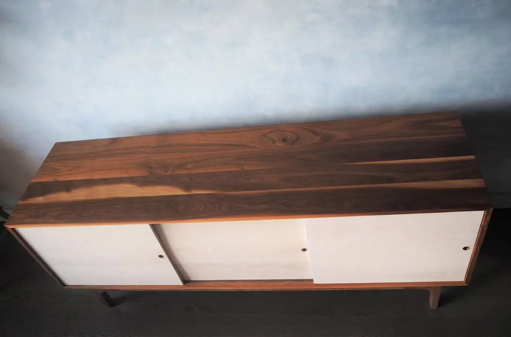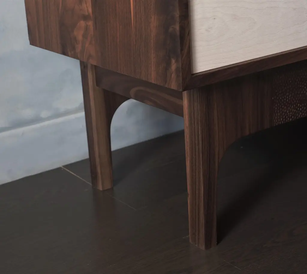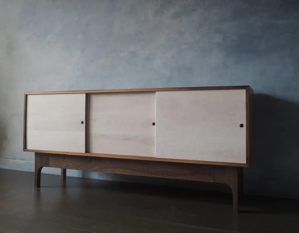 Our solid walnut sideboard is made from domestically harvested walnut. Highlighted with bleached beech doors and a hand-carved solid walnut base.These sliding doors are made with beechwood, which is bleached and then hand rubbed with a natural oil wax. The door pulls are made of solid brass.The base is made of solid walnut with a hand-carved stretcher connecting the two curved legs.This is a made to order piece, the length, height, width, and materials can be customized to suit your space and needs.