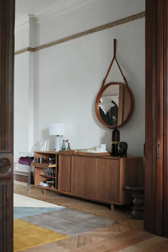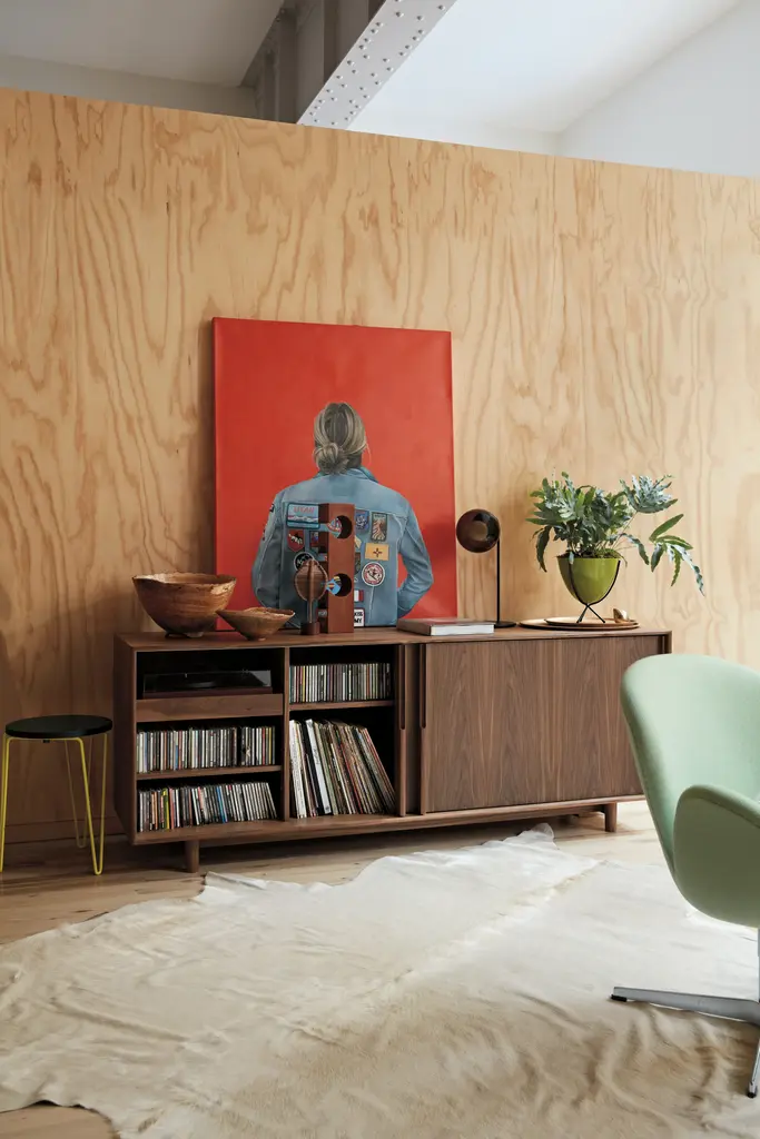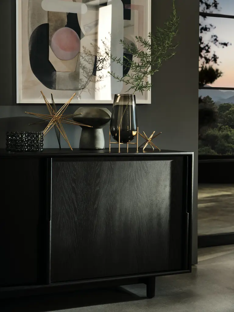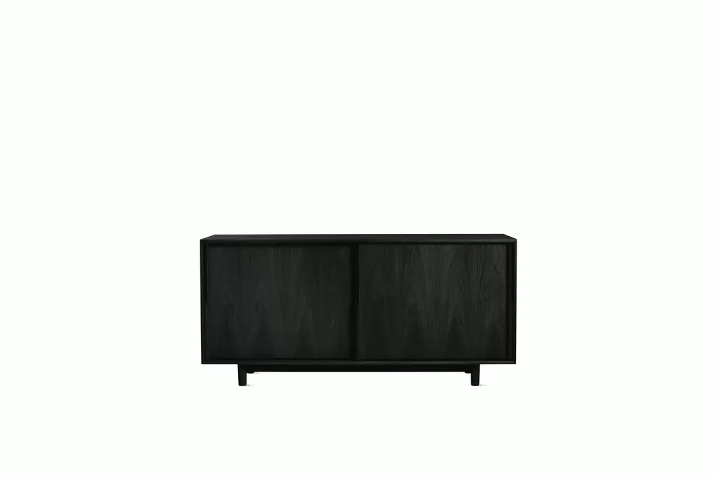Small version has three adjustable shelves and two drawers. Large version has five adjustable shelves, four drawers, and pullout media player shelf. Space behind shelves for routing cords. Solid wood handles and legs. Soft-close drawers with dovetail joints.