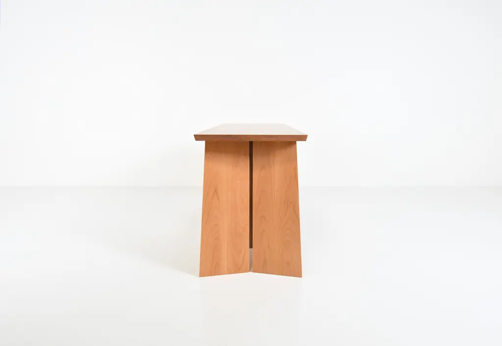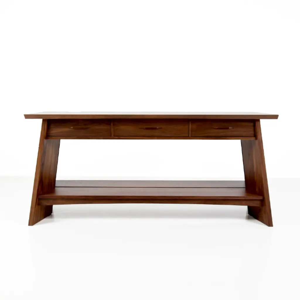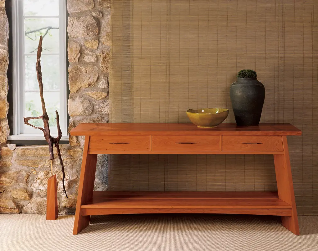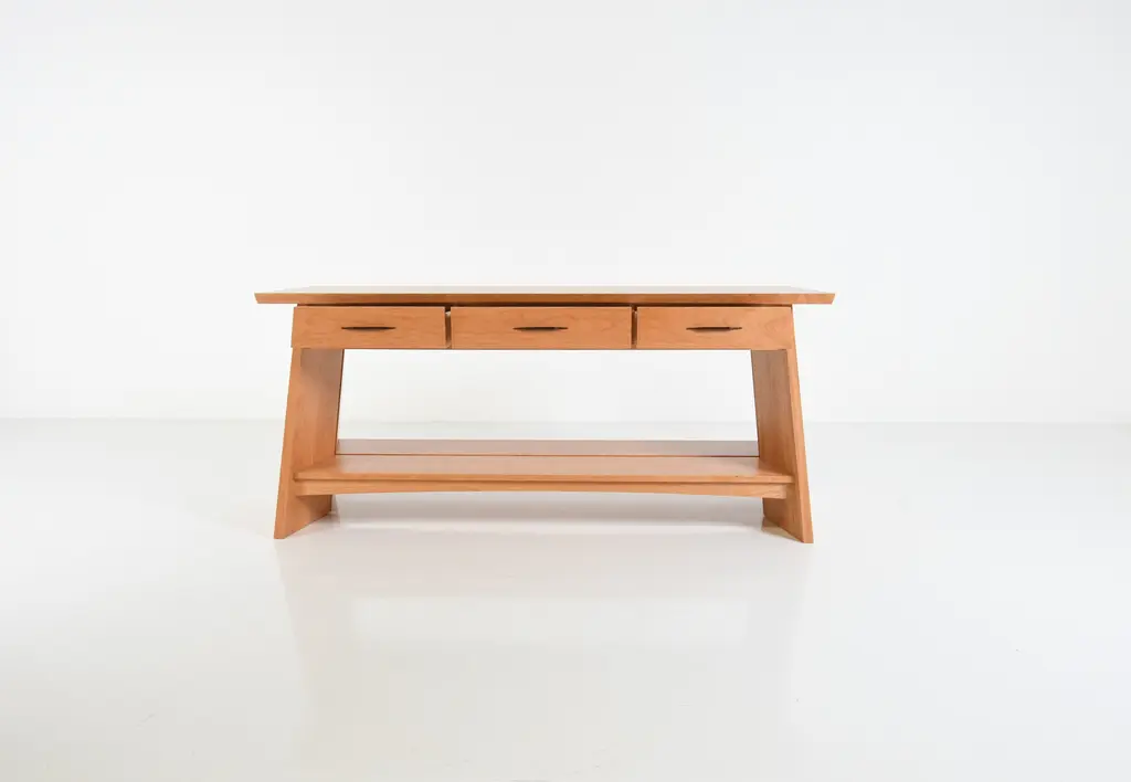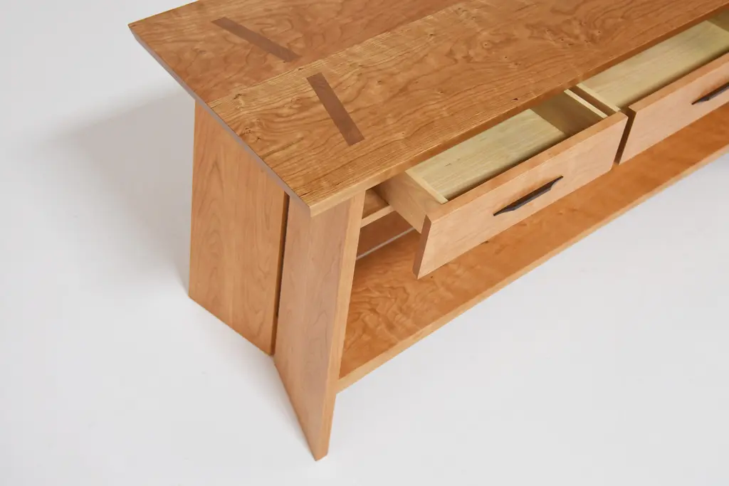Every detail of the Edo Open Sideboard exists to serve a function and will bear years of daily use. Its open design features three dovetailed drawers. Four legs, attached at a compound angle, are connected to a grain matched top. In addition to adding storage space, this piece offers strength and anchors the eye.
