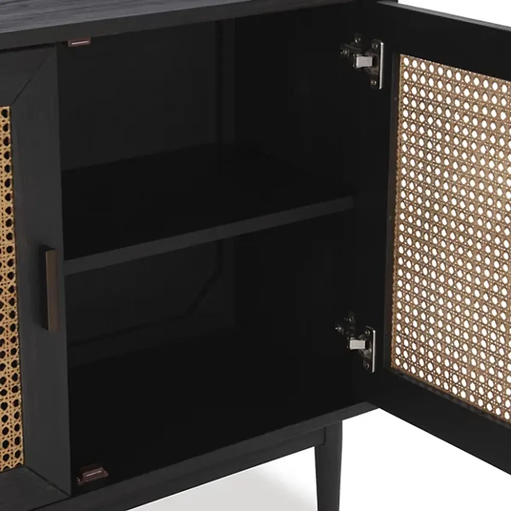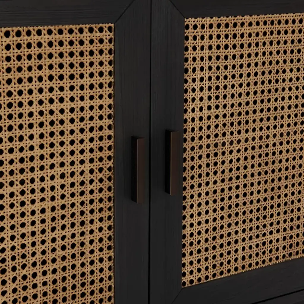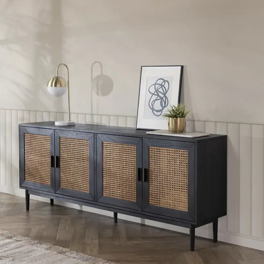 The Edris Sideboard from Classic Home extends the cabinet design to provide extensive storage across dining and living spaces. Woven cane door panels filter light while concealing stored items, and magnetic closures ensure secure operation without visible hardware. Pine wood construction utilizes reclaimed materials that retain authentic aging and character marks from their previous use. The longer proportions accommodate larger items while maintaining the same attention to natural wood variations that make each sideboard unique. Adjustable levelers provide stability, and the versatile design accommodates various interior approaches.