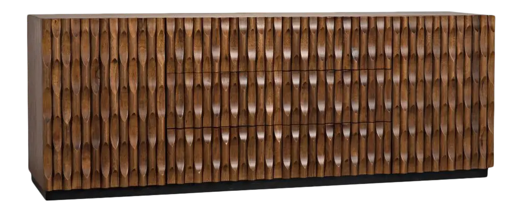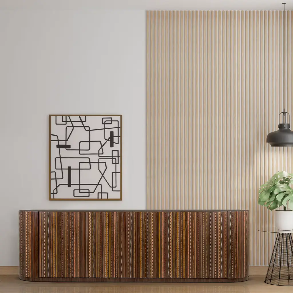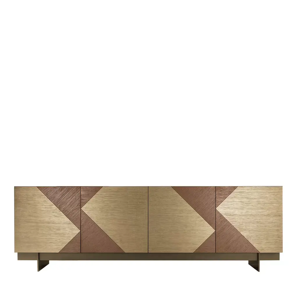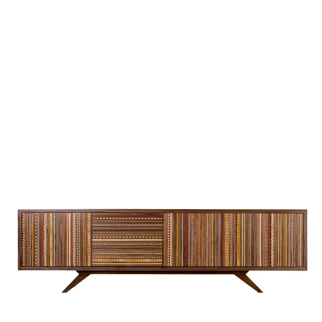 Rigor and eccentricity coexist in unexpected harmony in this exclusive walnut sideboard. Characterized by a vertical progression enhancing the general visual impact, a triumph of multicolor wooden inlays demands attention to an otherwise rigorous design. Each piece boasts a natural matte finish, ideal for complementing refined modern and contemporary interiors.