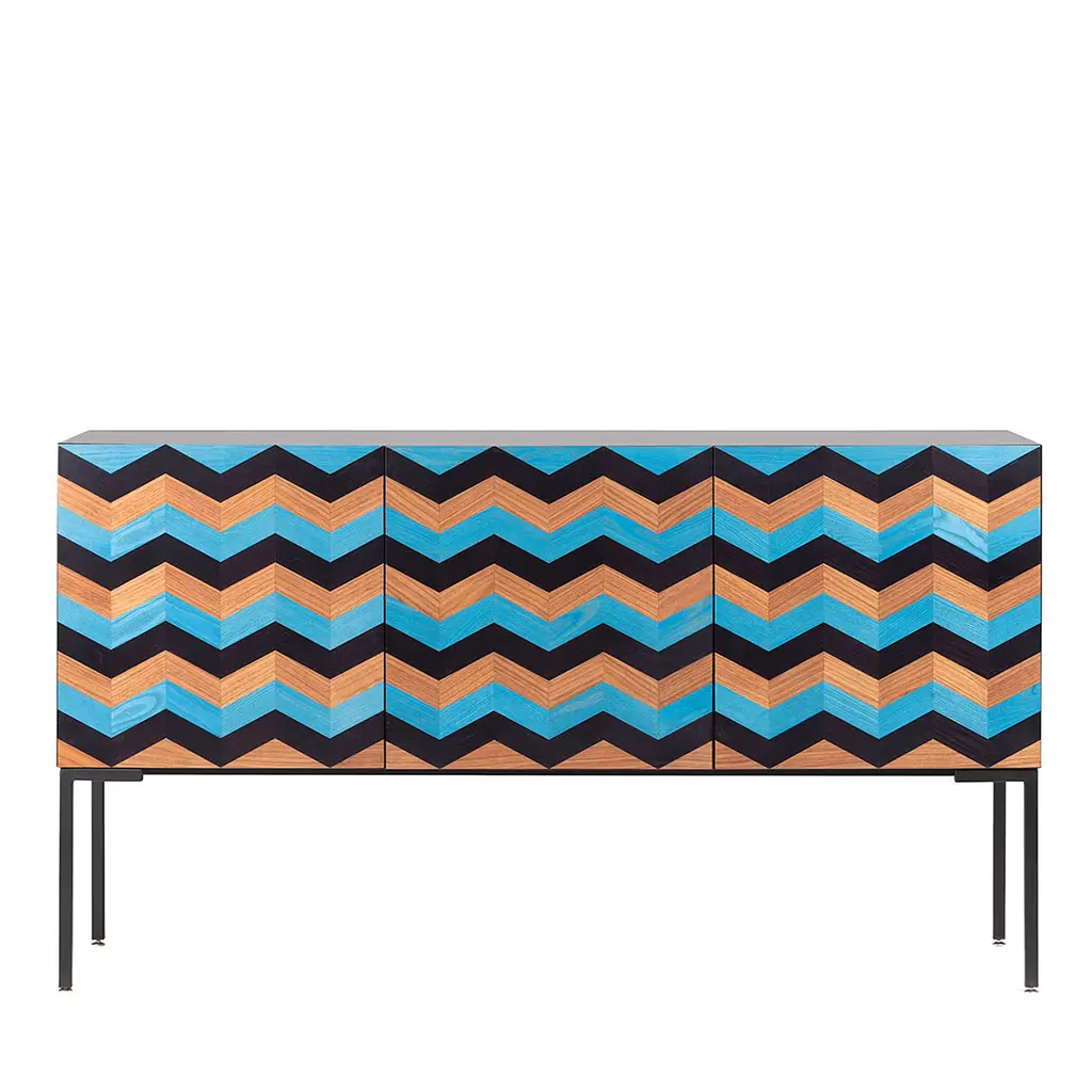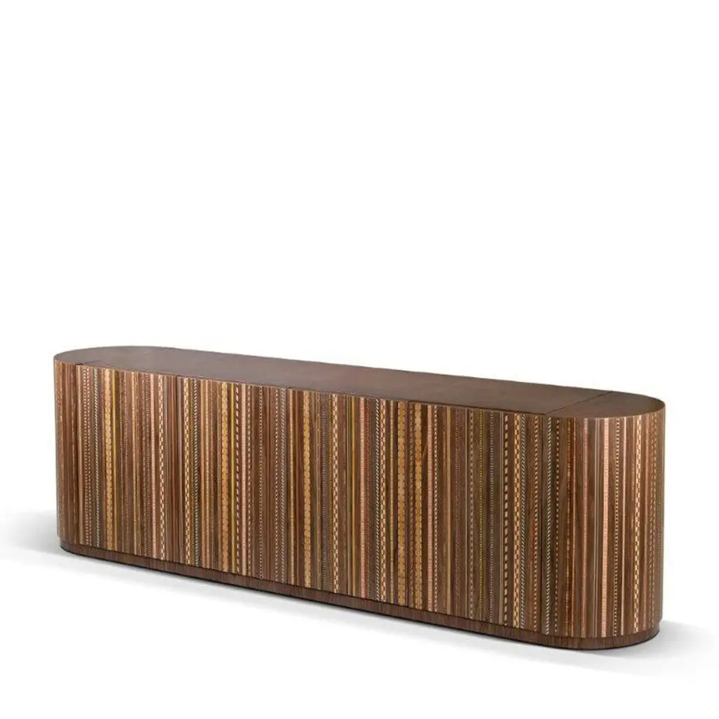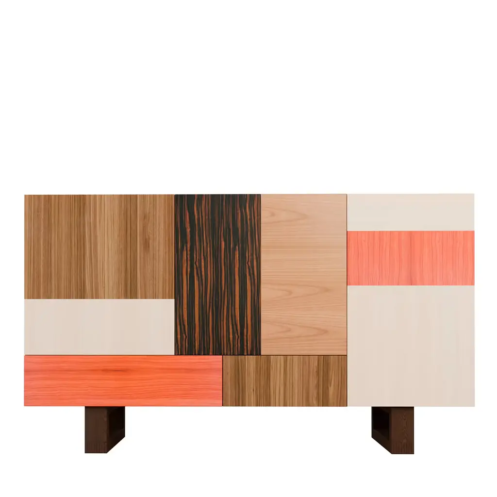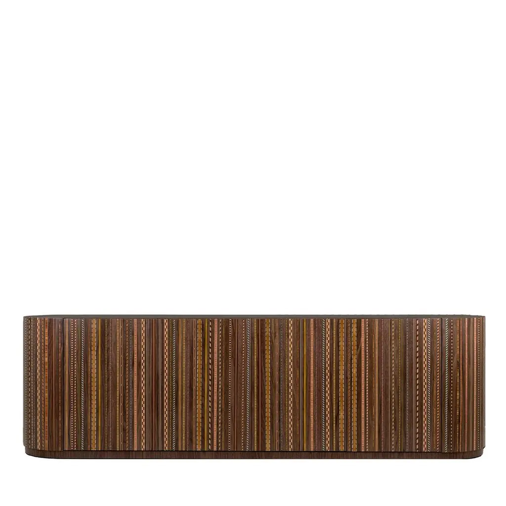 Rigor and eccentricity coexist in unexpected harmony in this exclusive walnut sideboard. Characterized by a vertical progression enhancing the general visual impact, a triumph of multicolor wooden inlays demands attention to an otherwise rigorous design. Each piece boasts a natural matte finish, ideal for complementing refined modern and contemporary interiors.