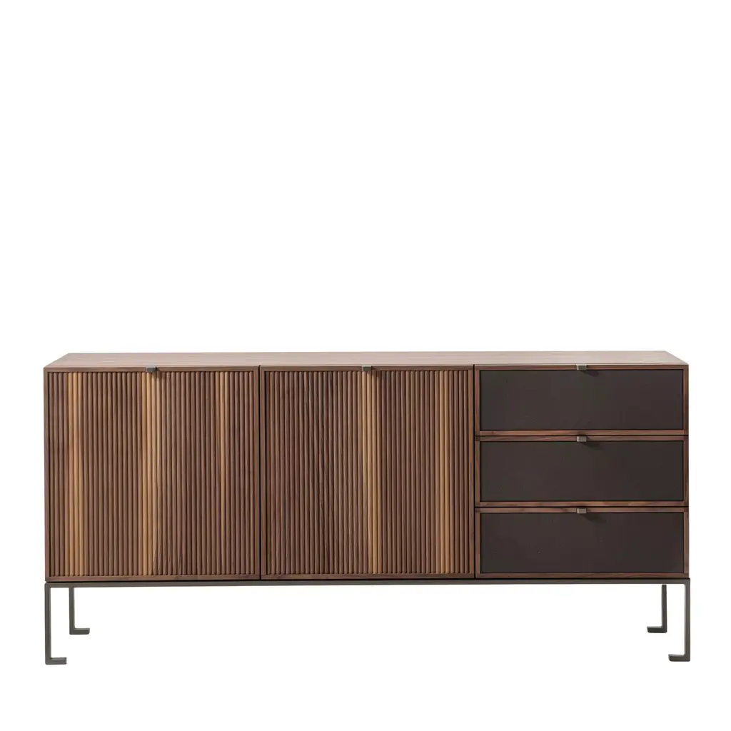 Like a ballerina on her toes, Elizabeth gracefully unfurls her luminous dress, as if made of pleated fabric. The characteristic folds add movement to the metal sheet along the surface of the cabinet, transforming each reflection into light. In an interplay of airiness and tension, elasticity and rigour, the metal vibrates with the rhythm of its pleats. Available in steel, brass or copper, Elizabeth gives shape to a new way of imagining unambiguously feminine metal furniture.
