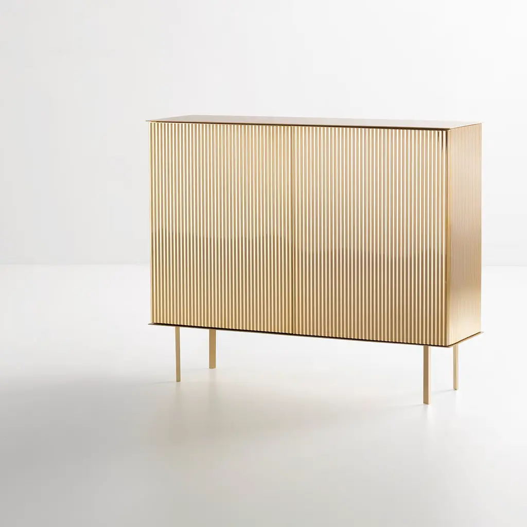 Like a ballerina on her toes, Elizabeth gracefully unfurls her luminous dress, as if made of pleated fabric. The characteristic folds add movement to the metal sheet along the surface of the cabinet, transforming each reflection into light. In an interplay of airiness and tension, elasticity and rigour, the metal vibrates with the rhythm of its pleats. Available in steel, brass or copper, Elizabeth gives shape to a new way of imagining unambiguously feminine metal furniture.