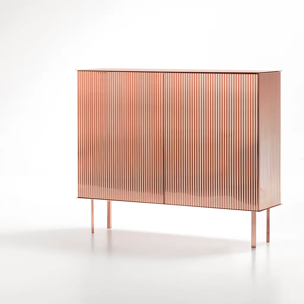 Like a ballerina on her toes, Elizabeth gracefully unfurls her luminous dress, as if made of pleated fabric. The characteristic folds add movement to the metal sheet along the surface of the cabinet, transforming each reflection into light. In an interplay of airiness and tension, elasticity and rigour, the metal vibrates with the rhythm of its pleats. Available in steel, brass or copper, Elizabeth gives shape to a new way of imagining unambiguously feminine metal furniture.