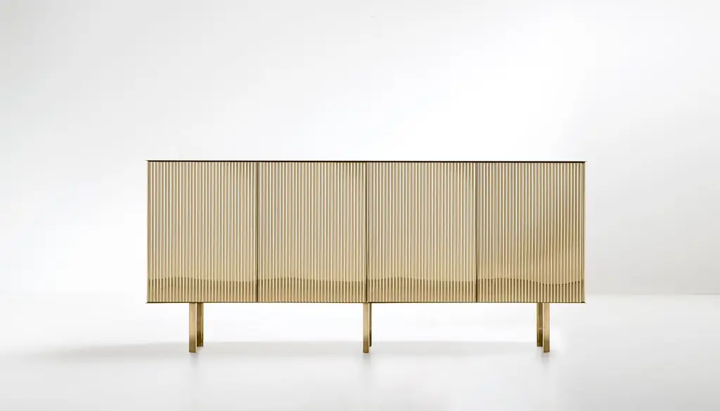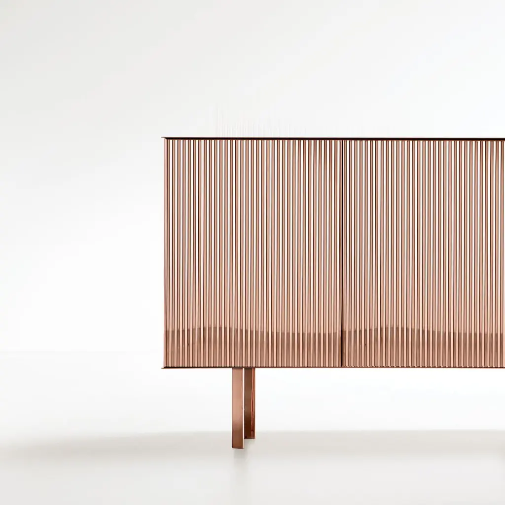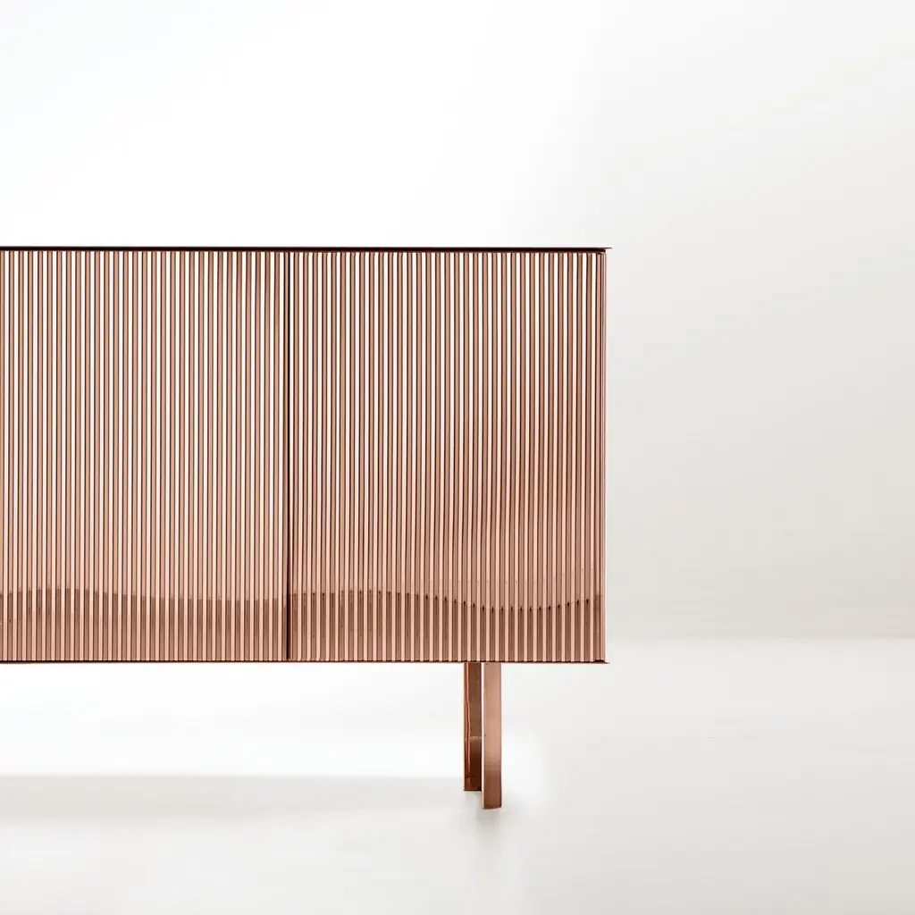 Elizabeth Sideboard by De CastelliDimensions: W 183 x D 45 x H 80 cmMaterials: Polished Copper, WoodBrass and Stainless Steel versions are available. Two-door and six-door versions also available. Please contact us for any request.Like a ballerina on her toes, Elizabeth gracefully unfurls her luminous dress, as if made of pleated fabric. The characteristic folds add movement to the metal sheet along the surface of the cabinet, transforming each reflection into light. In an interplay of airiness and tension, elasticity and rigour, the metal vibrates with the rhythm of its pleats. Available in steel, brass or copper, Elizabeth gives shape to a new way of imagining unambiguously feminine metal furniture.DE CASTELLI“HARD COUTURE”Faithful to its decision to reinstate the special role of metal in design and experimentation, De Castelli infuses artisan ideas and workmanship into industrial processes, leading to entirely original results. The encounter with design inspires an approach to materials founded upon respect for their potential, be it hidden or obvious, which emerges slowly in a collection of pieces that, despite being part of a series, remain unique.Unique not only for the hand that has created them, but also for the singular cultural path that focuses on the aesthetic (and not just practical) value of the primordial material with which De Castelli shapes living spaces.A BESPOKE APPROACHEach object, even in the repetition of form, is a creative act in and of itself, one that incorporates a heritage of constantly-evolving expertise and research. The equation that relegates ‘cold’ metals to the margins of furnishing projects is thus overturned, bringing iron, brass and copper, in their infinite variations and finishes, to the centre of an entirely renewed stage, allowing them to finally shine with their own light.SUSTAINABILITYDe Castelli has always been committed to making the entire production cycle increasingly sustainable, aware that metal, the material with which its business identifies itself, is precious and must be treated with care, without waste.PEOPLE FIRSTThe wide spaces of the De Castelli headquarters in Crocetta del Montello (TV) allow those who work to enjoy environments where order, cleanliness and safety are always maintained and guaranteed. An attitude of attention and respect for people that has led to the shared ethical code.
