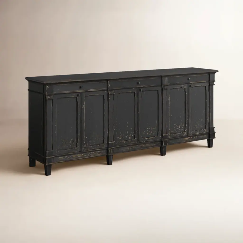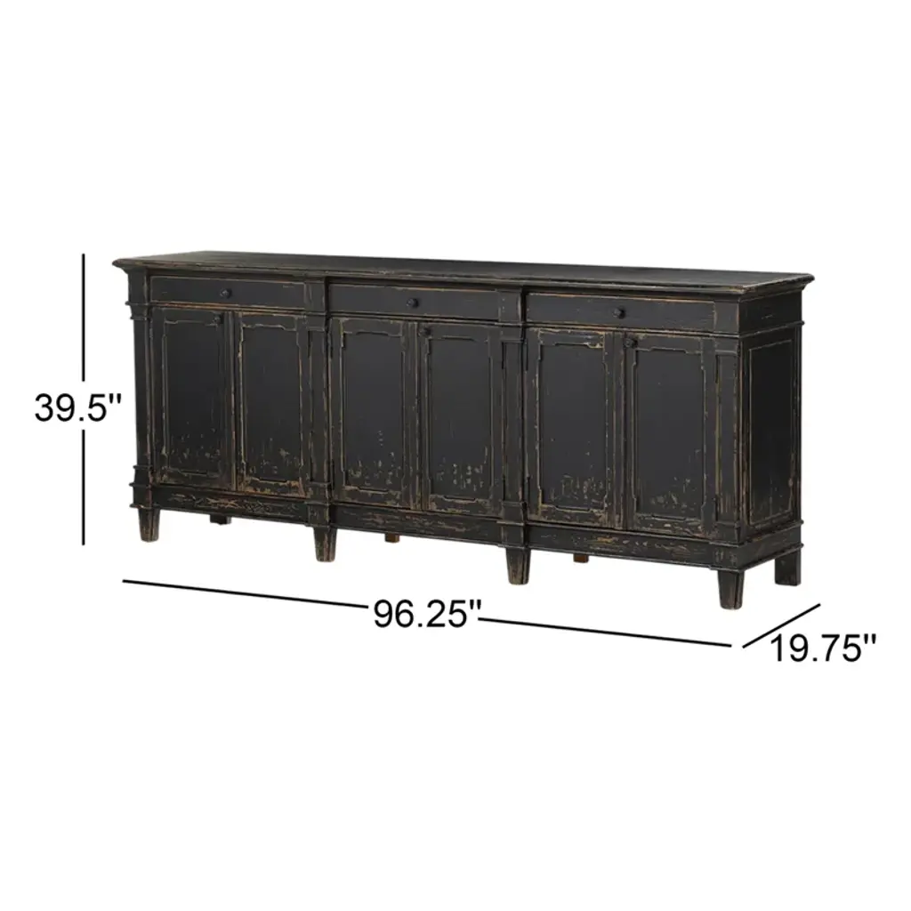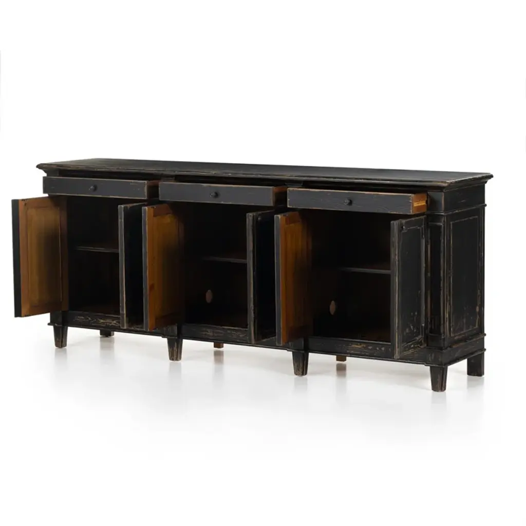 This solid pine sideboard brings a timeless, antique-inspired charm to your dining room or living space. Finished in a distressed black, it evokes the warmth and character of a cherished heirloom. With six paneled doors and three top drawers, this piece offers ample storage for your dinnerware, linens, or media essentials. Thoughtful design details like spade feet and rear cutouts for cable management enhance its functionality. The purposeful distressing adds a layer of rustic elegance, making it a versatile addition to both classic and contemporary settings. Plus, its generous size is sure to stand out in any room.