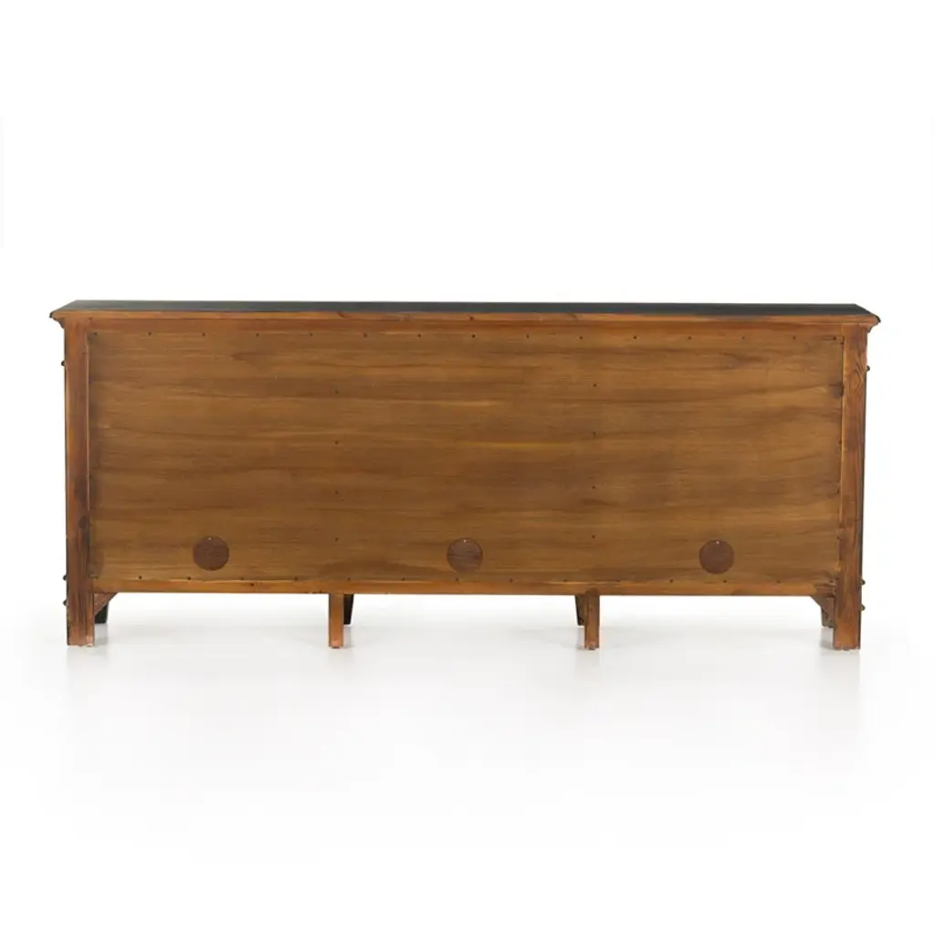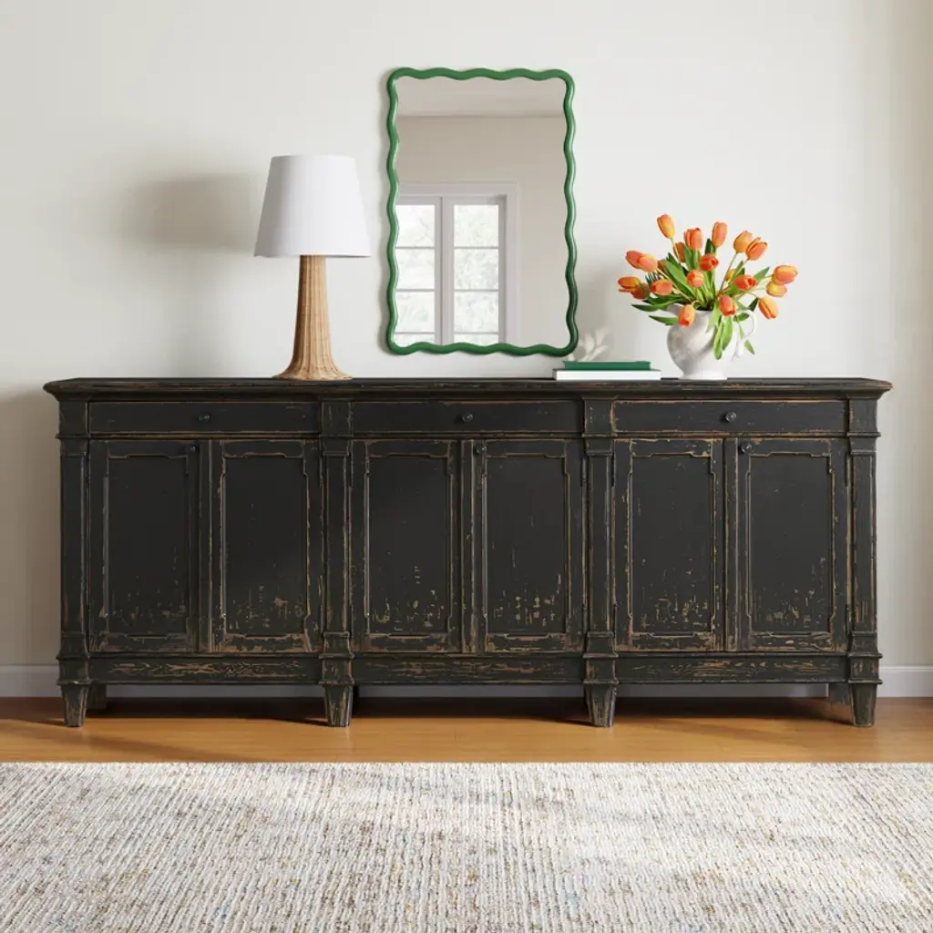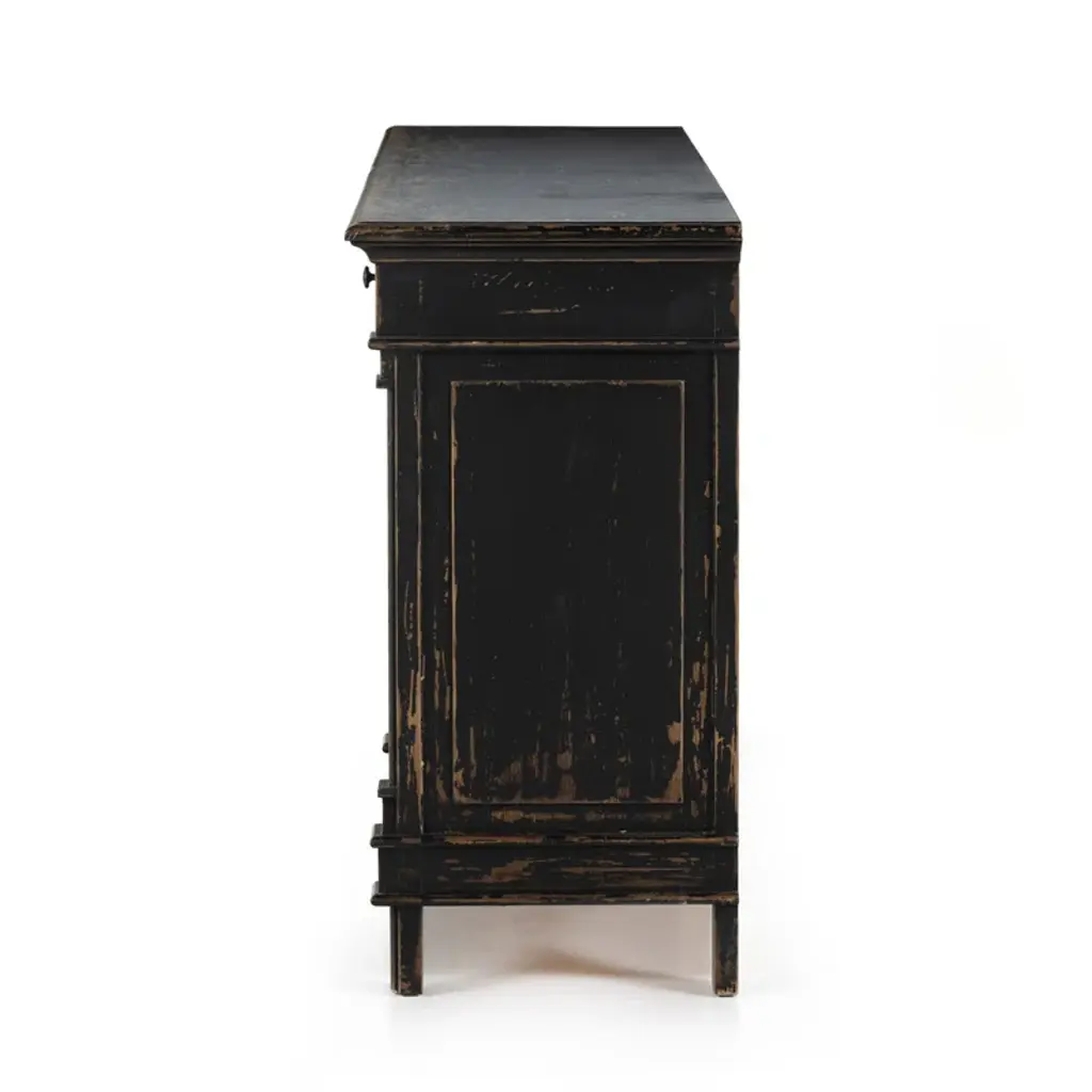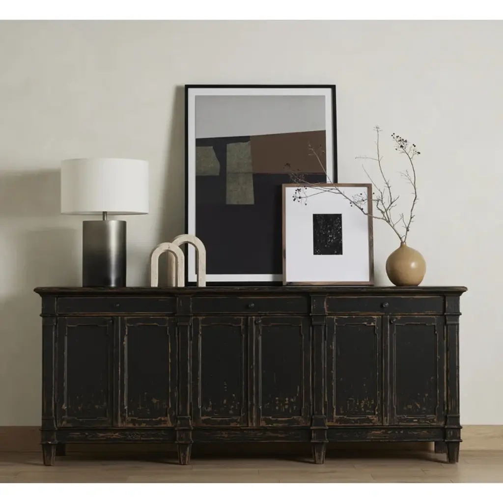 This solid pine sideboard brings a timeless, antique-inspired charm to your dining room or living space. Finished in a distressed black, it evokes the warmth and character of a cherished heirloom. With six paneled doors and three top drawers, this piece offers ample storage for your dinnerware, linens, or media essentials. Thoughtful design details like spade feet and rear cutouts for cable management enhance its functionality. The purposeful distressing adds a layer of rustic elegance, making it a versatile addition to both classic and contemporary settings. Plus, its generous size is sure to stand out in any room.