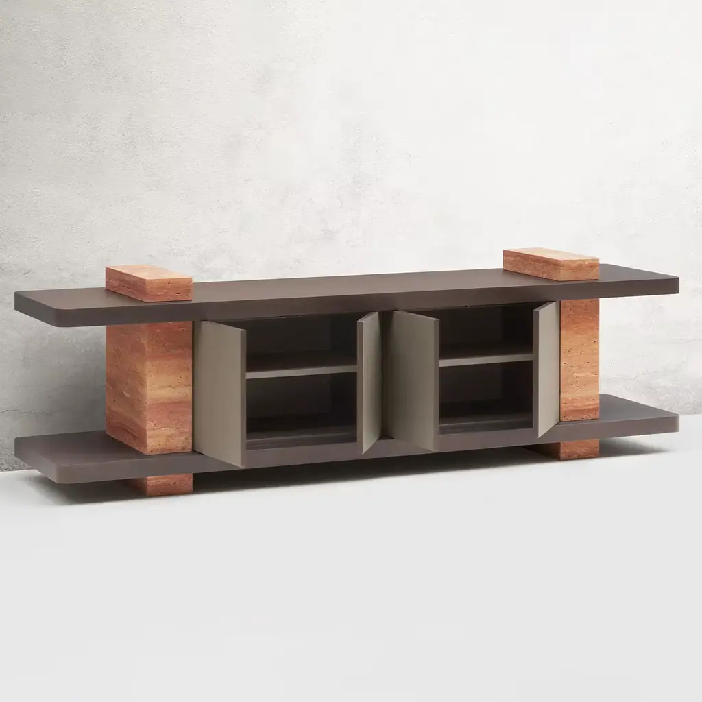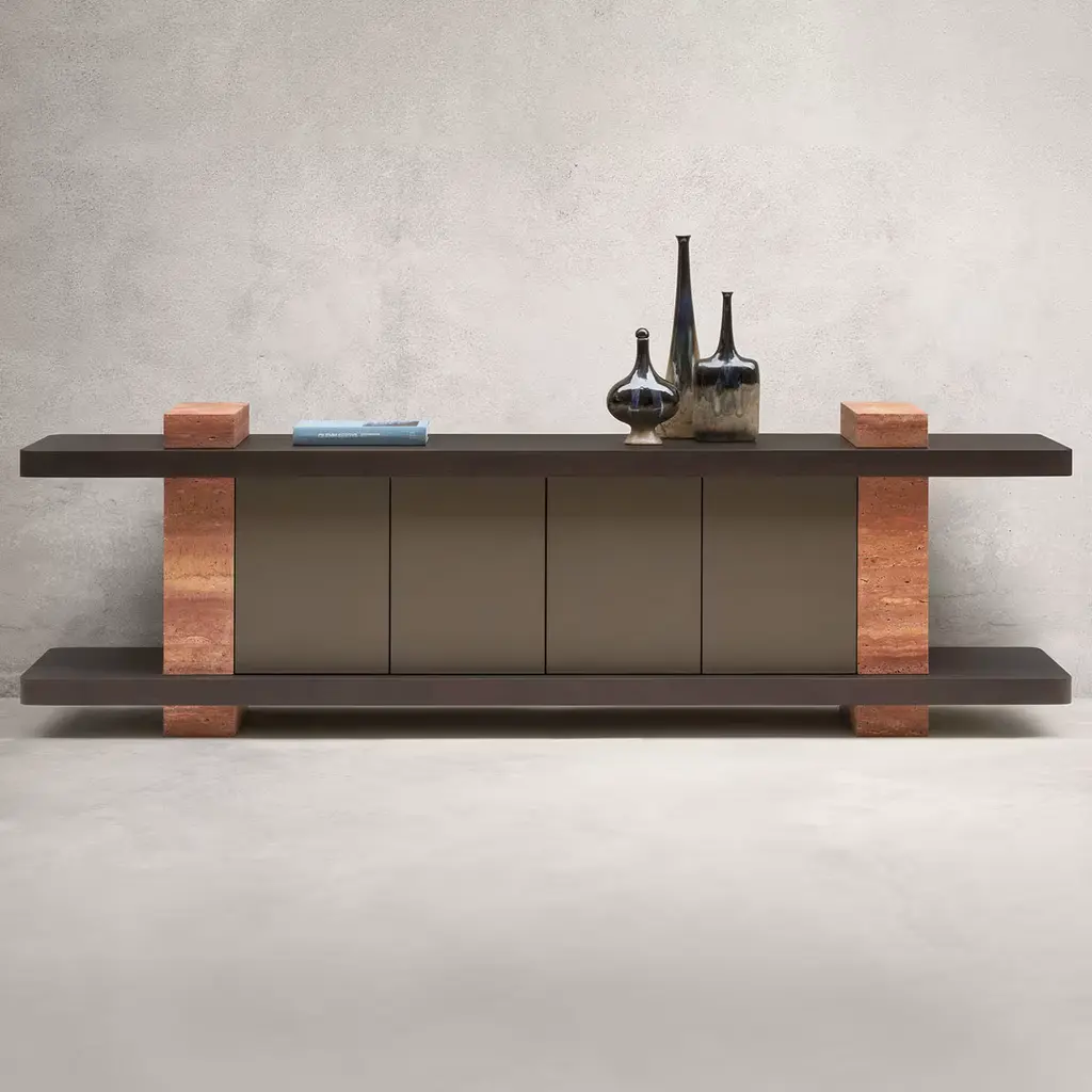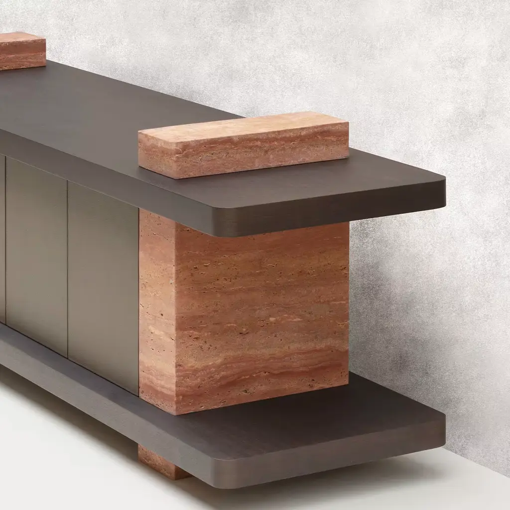 Elliot is a collection of massive furniture made of highly geometric volumes intersecting each other. Every creation is thus a monolithic statement piece that plays with contrast, texture, color, and light. Partially leather-covered wood base with monolithic travertine side legs. Different Travertino and wood finishes are available upon request. Custom sized available on request.