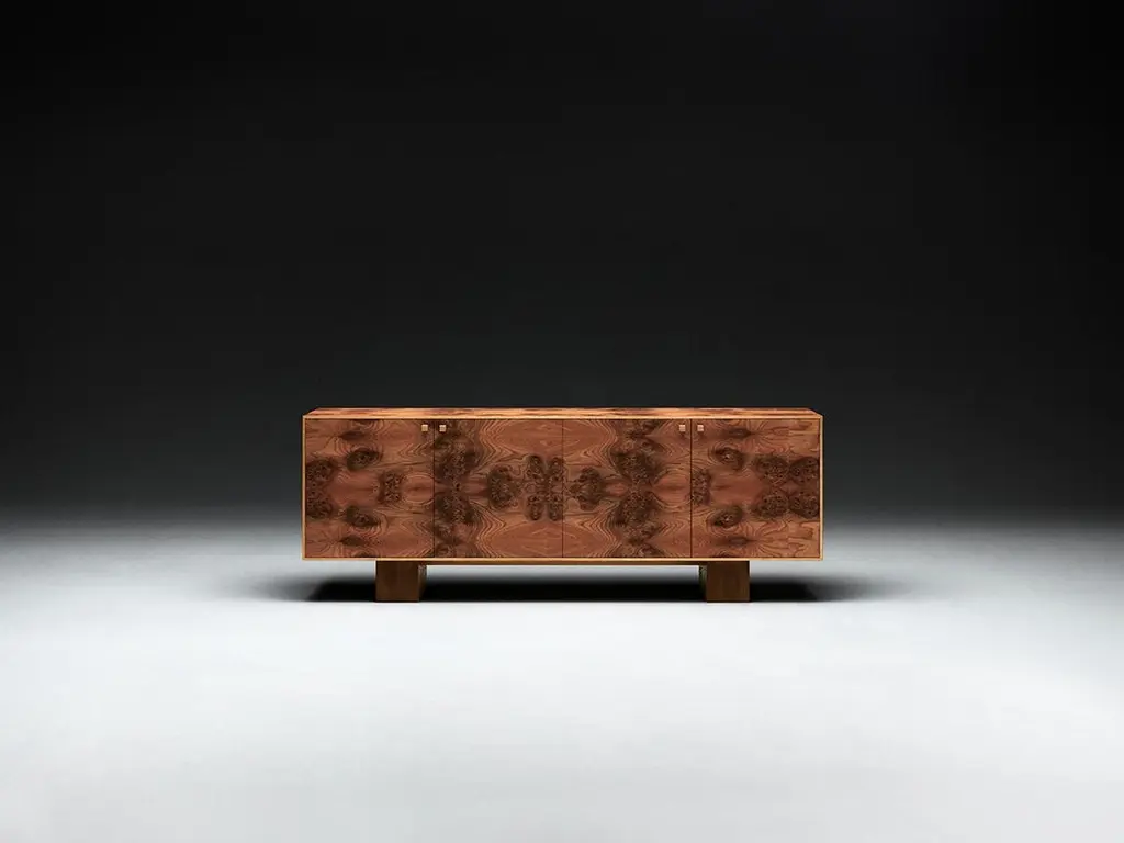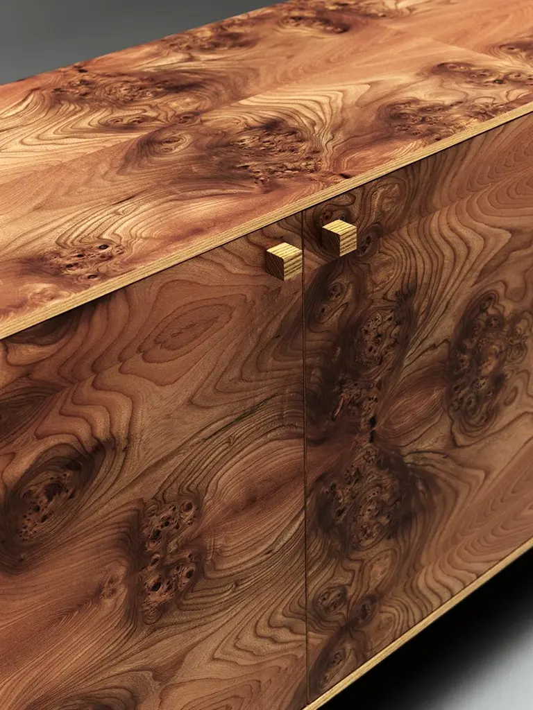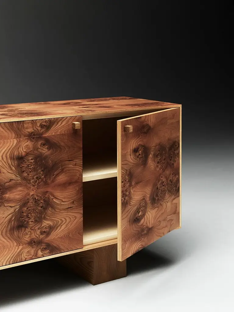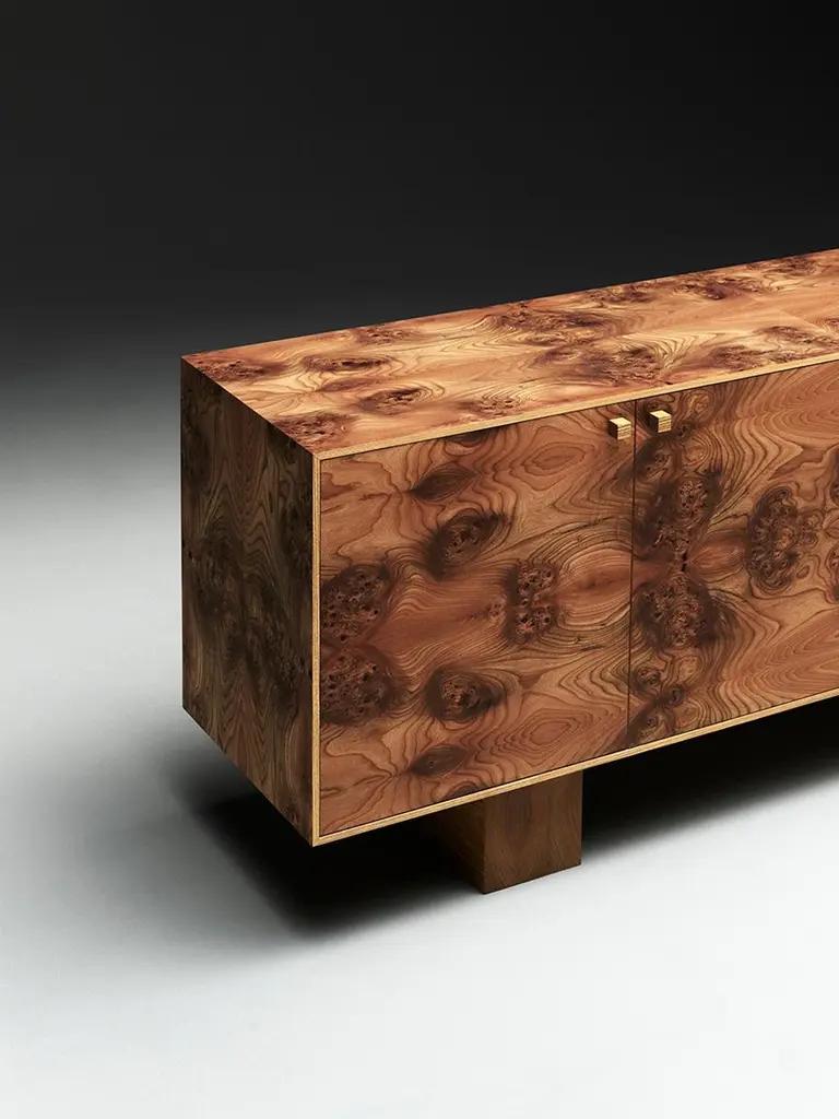 The Elm Burl Sideboard merges inspiration from historic furniture design with brutalist references. Made out of elm burl, the piece combines the warmth of the wood with a minimalist, contemporary design.