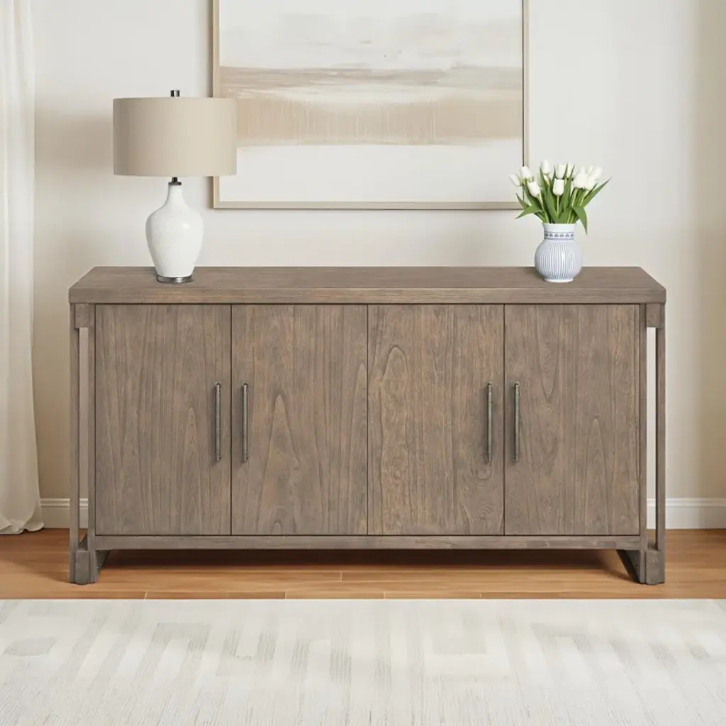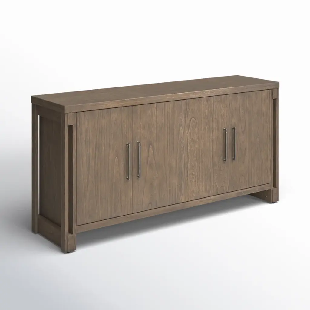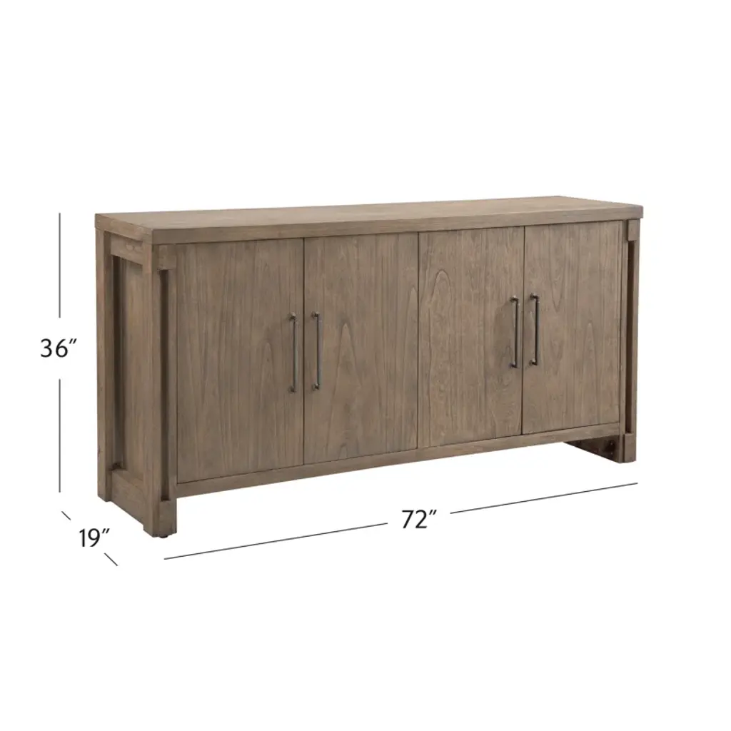 The sideboard blends modern rustic farmhouse design with timeless craftsmanship. Crafted from solid mindi wood in a natural finish. Featuring four doors, two adjustable shelves, and media cord management, this cabinet seamlessly combines style with practicality. The light antique brass bar pull hardware adds character, enhancing the warm and inviting feel. With interlocking wood beams in end panels, the case design creates a unique and charming statement.