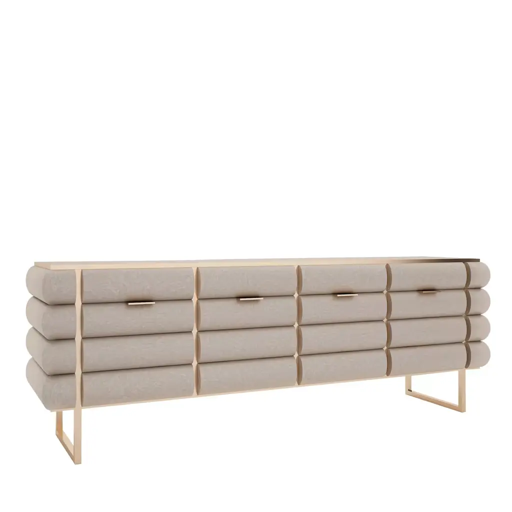 The lavish yet sophisticated flair characterizing this sideboard makes it perfect to be a versatile furniture piece. Sitting atop a brass-finished, light metal base, its wooden silhouette comprises four wide compartments and its surface is enlivened by pillow-like layers upholstered with soft gray fabric (or with leather upon request). Other wood and metal finishes or lacquers are available, please inquire with the Concierge for further details.