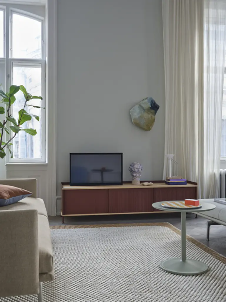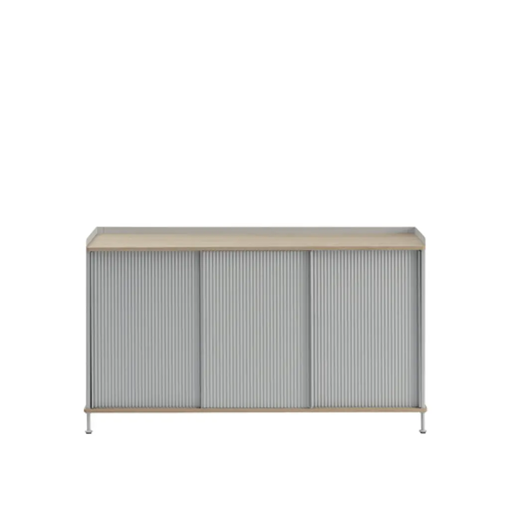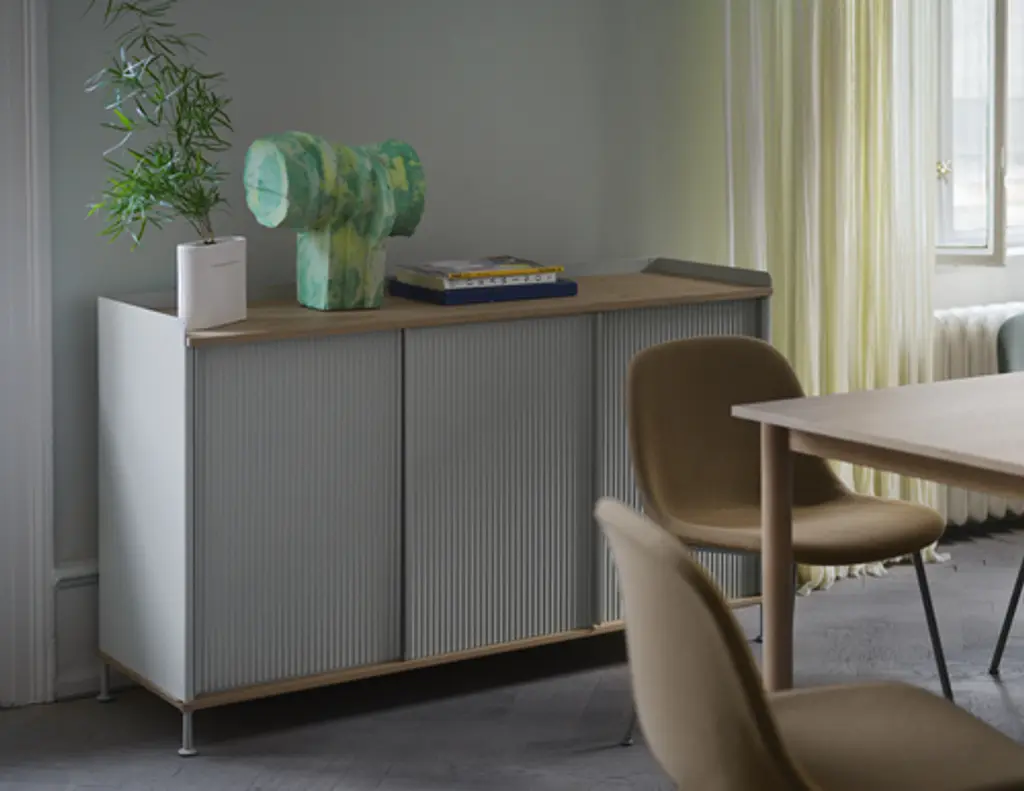The Enfold Sideboard combines industrial materiality with residential references for a new perspective on modern storage. Made from a lacquered steel that gently enfolds its top and bottom in solid oak, the Enfold Sideboard fuses cold and warm materials for a unique expression, paired with the vibrantly modern expression of its ridged steel doors. The flexible design is available in four sizes, which all have adjustable shelves and discreet cable outlets. This offers the opportunity to find just the right fit for your space, function and needs — be it a media console, in the hallway or a tall sideboard for storage.
