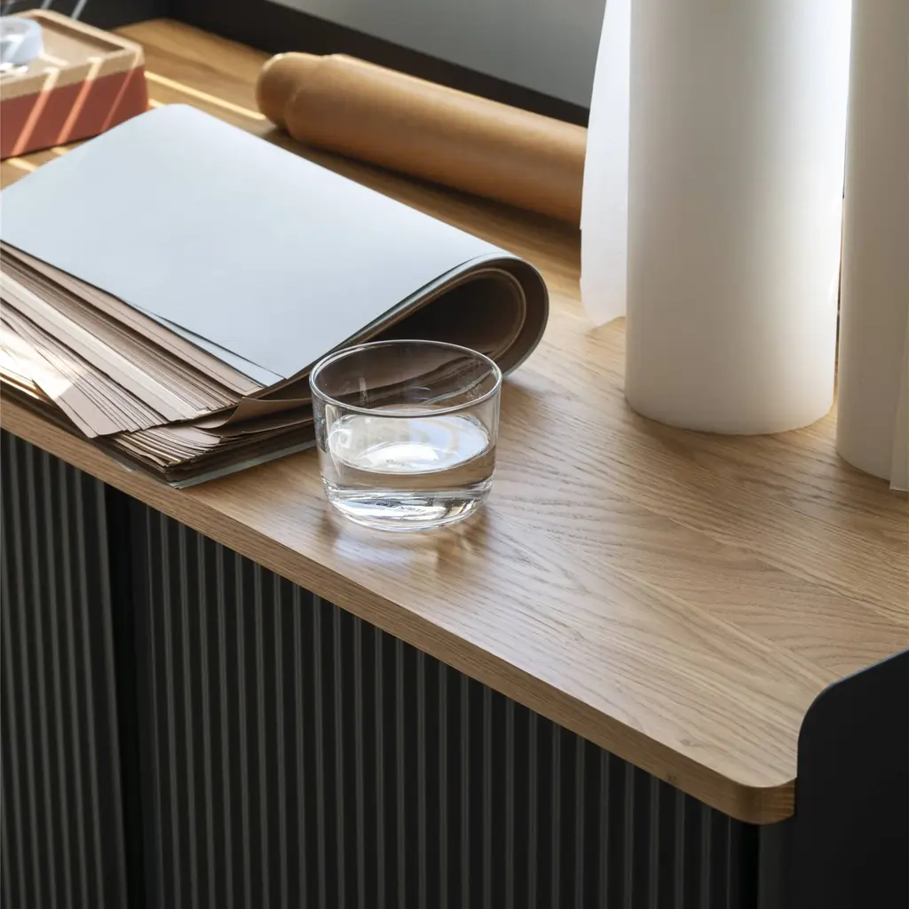 Enfold is a sophisticated riff on industrial style with its sliding lacquered steel doors “enfolded” into the top and bottom panels in solid oak. Melding appreciably warm and cold materials, the scheme accommodates both vertical and horizontal models, each with a set of adjustable shelves. The brainchild of globally acclaimed designer Thomas Bentzen, Enfold is available in a range of striking color finishes.