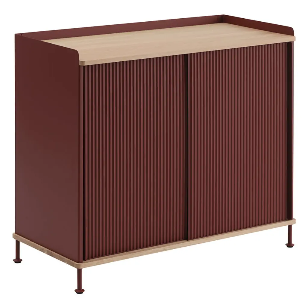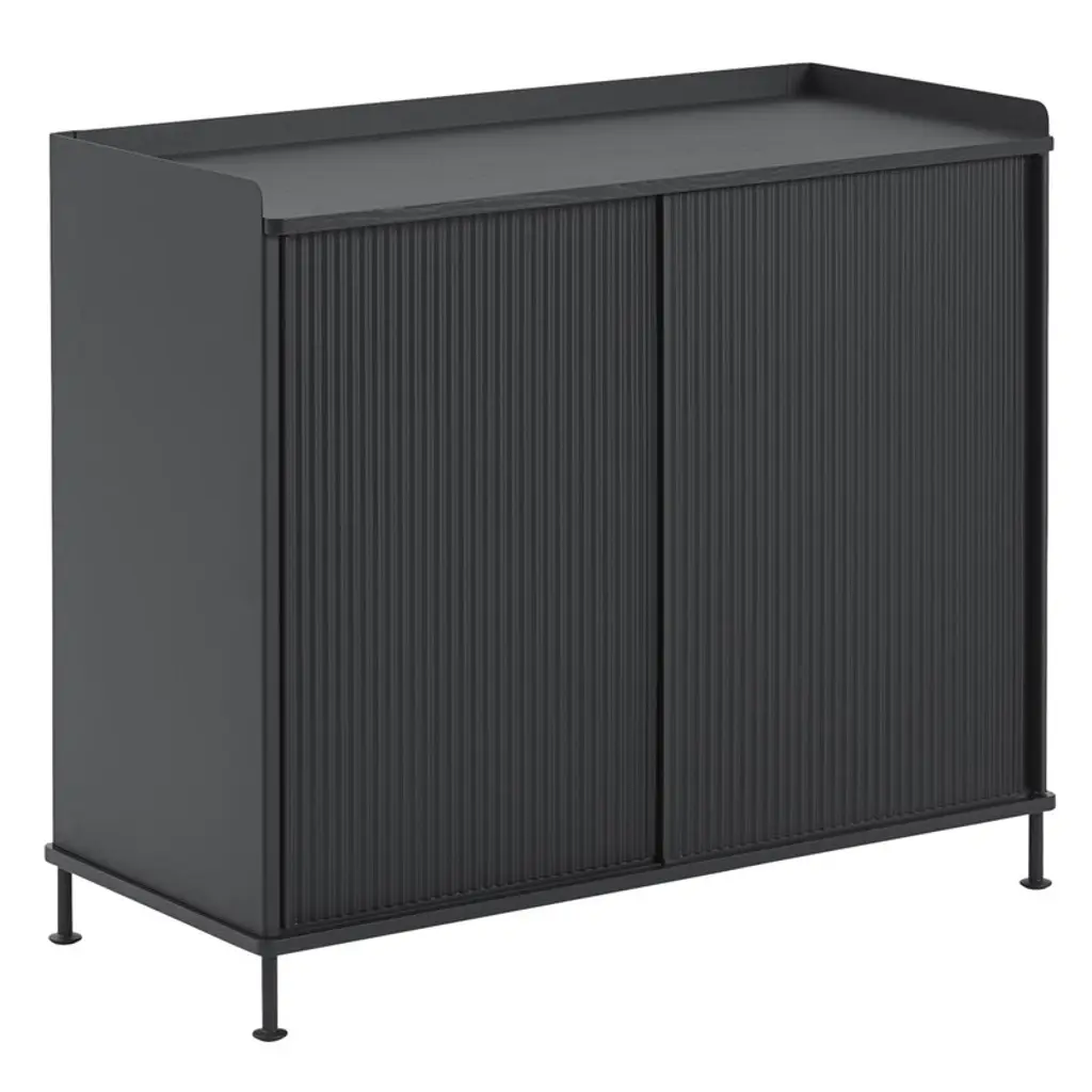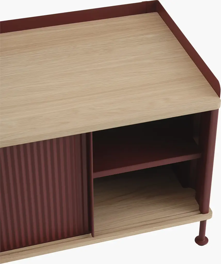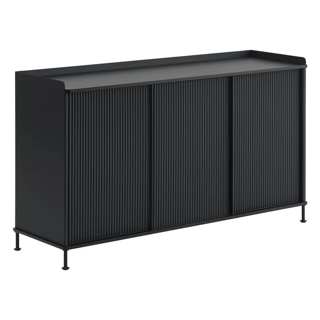 The Enfold Sideboard (2018) combines industrial materiality with residential references for a new perspective on modern storage. Made from lacquered steel that gently enfolds its solid wood top and bottom, it fuses cold and warm materials for a unique expression, paired with the vibrantly modern look of its ridged steel doors. Made in Sweden.