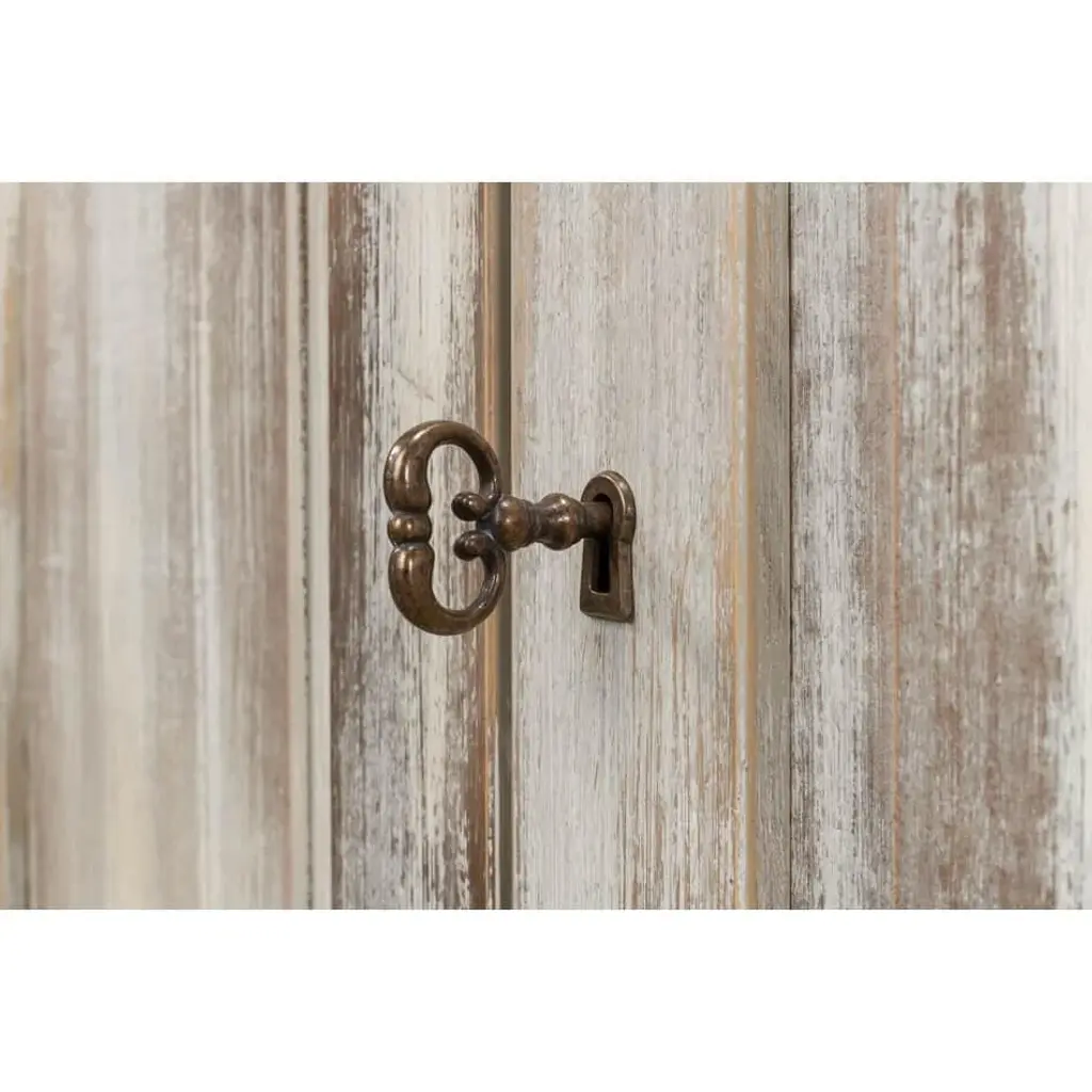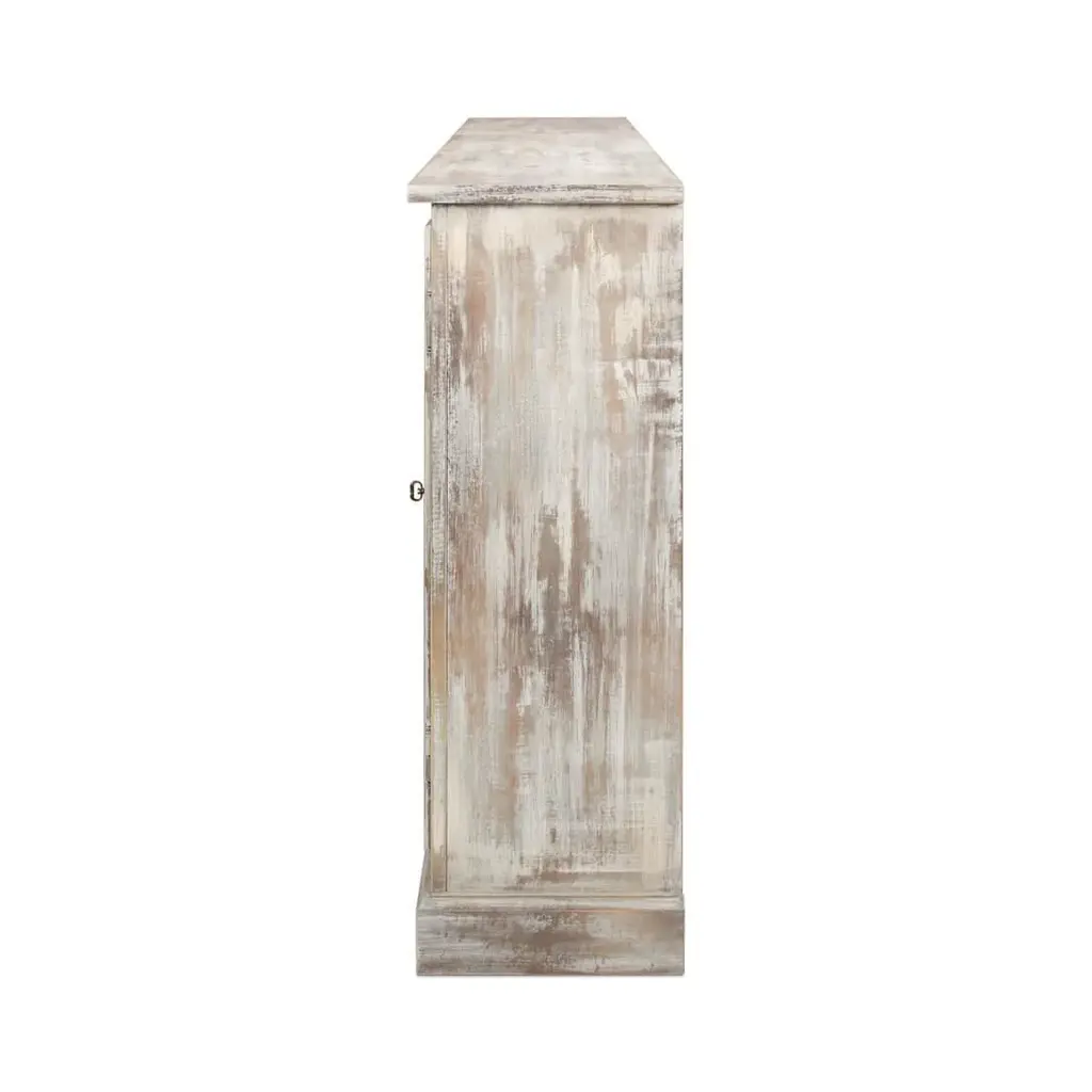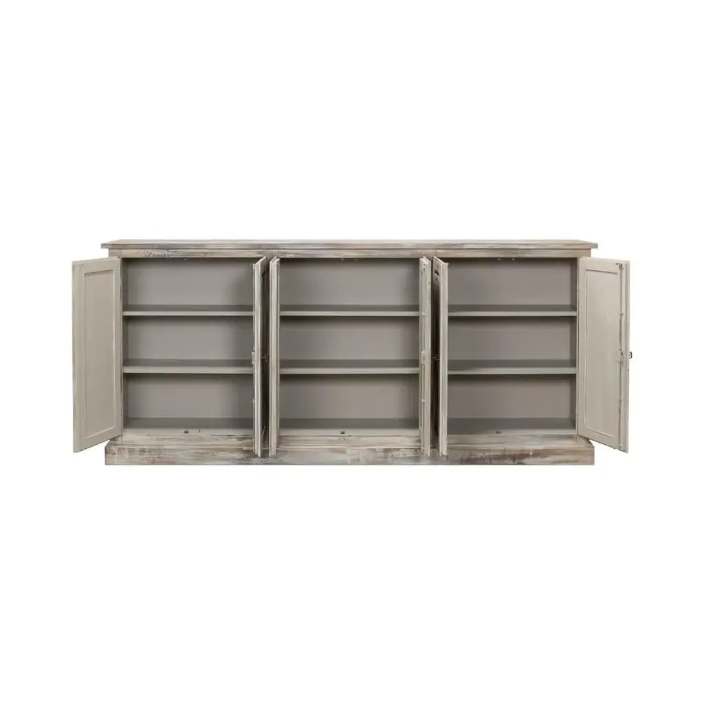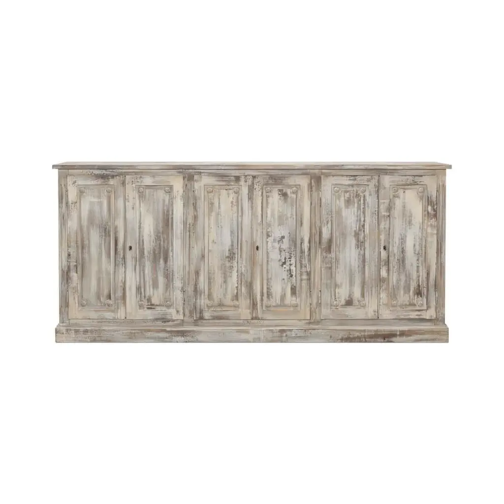 With six paneled cupboard doors, each adorned with carved floral rosettes, raised on a simple square plinth base. This substantial piece brings a storied elegance to your dining area or living space. The beautifully weathered gray finish creates a soft, time-worn look, while the classic panel doors and vintage-style hardware evoke images of a rustic countryside retreat. This sideboard offers generous length and ample storage space, making it as functional as it is decorative. Whether it's displaying your cherished family heirlooms or storing your dinnerware, this piece adds a touch of nostalgic charm to any room it graces. Dimensions: 96" W x 15" D x 43" H