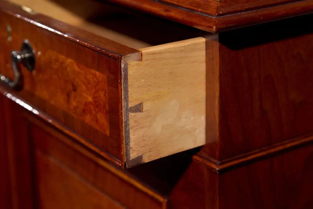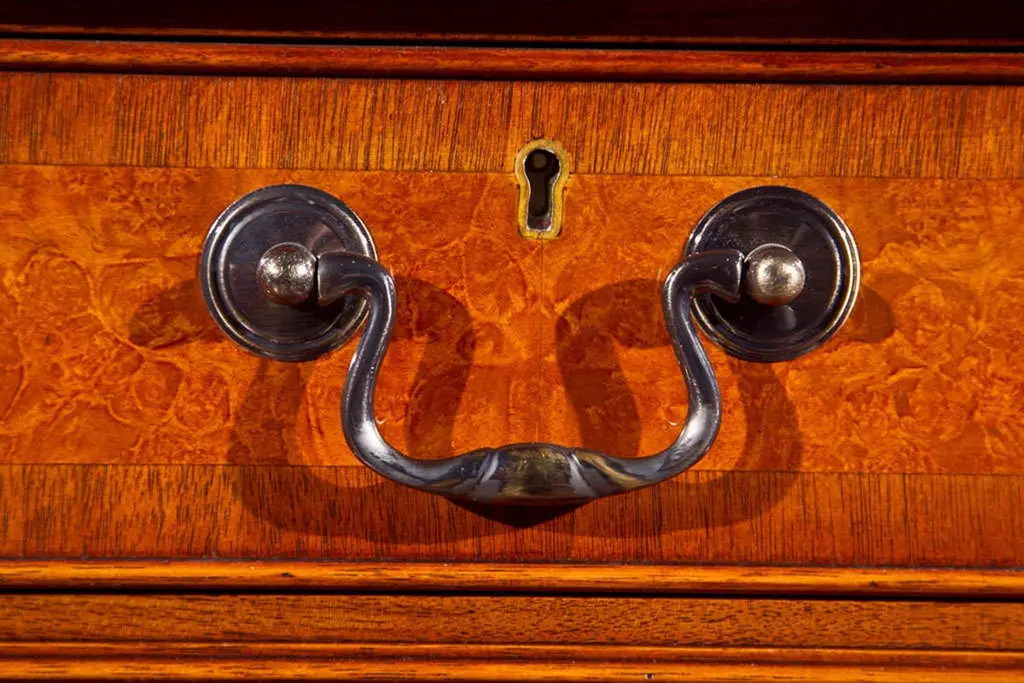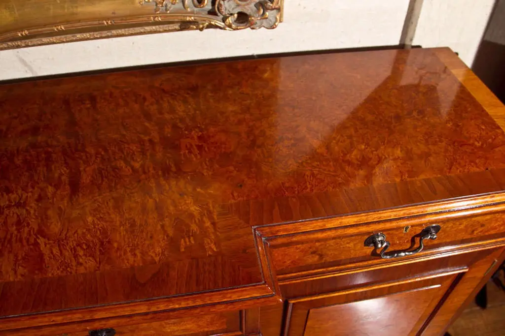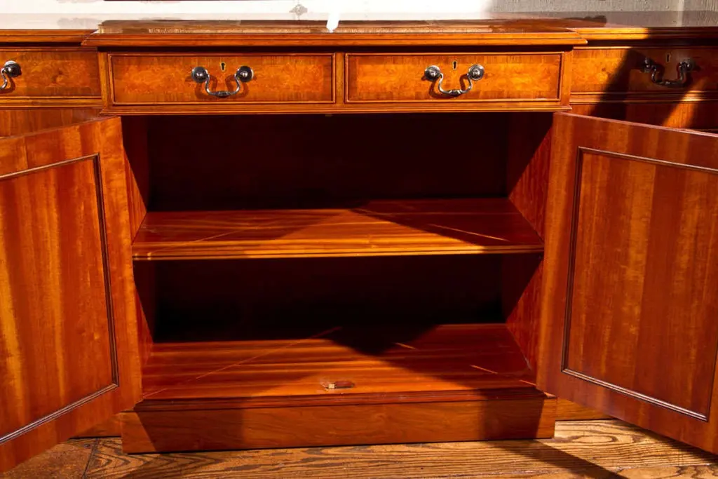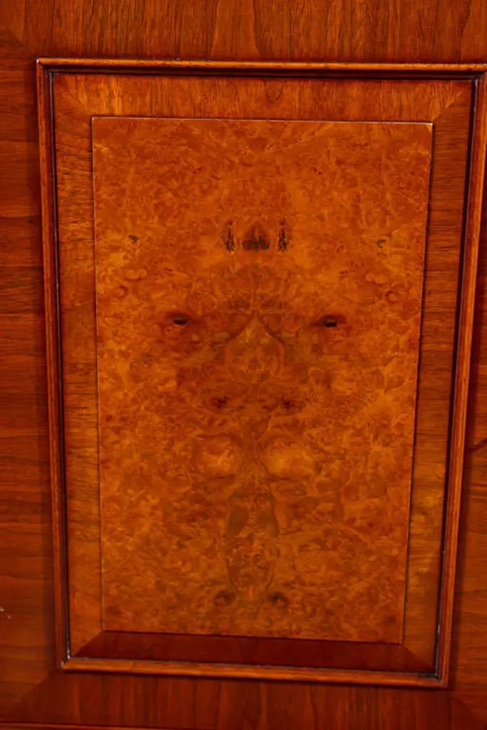 This walnut and walnut burl breakfront server/credenza offers clean design and copious storage space while bridging the divide between modern and traditional. The Classic style and tightly burled walnut grain combine to give this server a look that would be at home in just about any environment.Though this server is 76" long, it is available in an 86" length. It is also available in English yewwood or mahogany. In addition, it can be special ordered in any size between 66" and 90" in length.