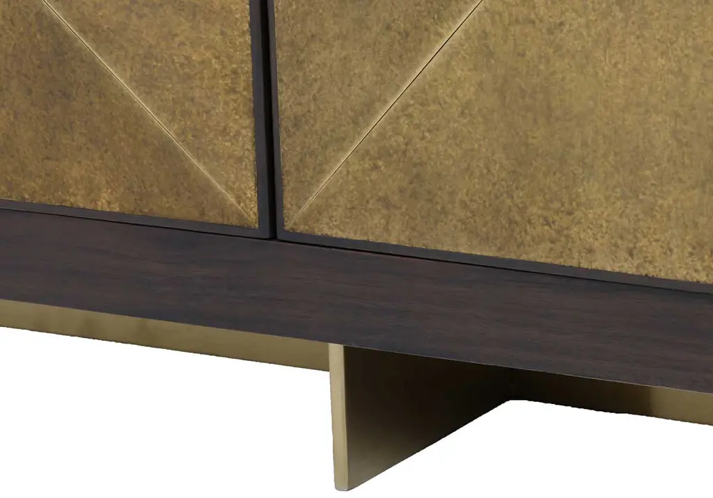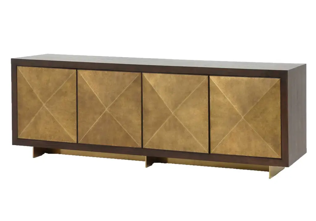 This sideboard makes a glamorous statement with its faceted brass-clad front panels set on a dark walnut frame. Its beautiful contrasting design is elevated by planked legs, finished in matching brass. Its visual texture and elongated size style well into living rooms or offices, providing ample hidden storage and a handsome touch.
