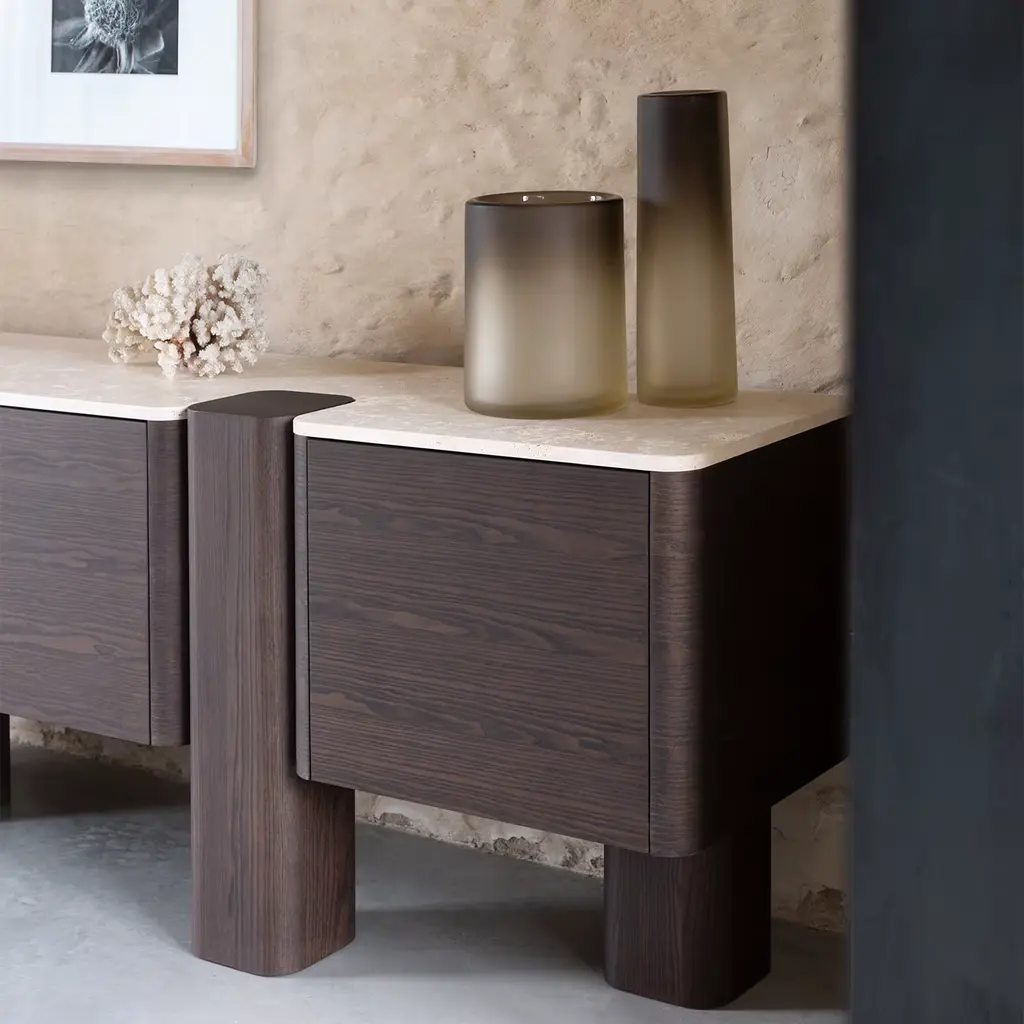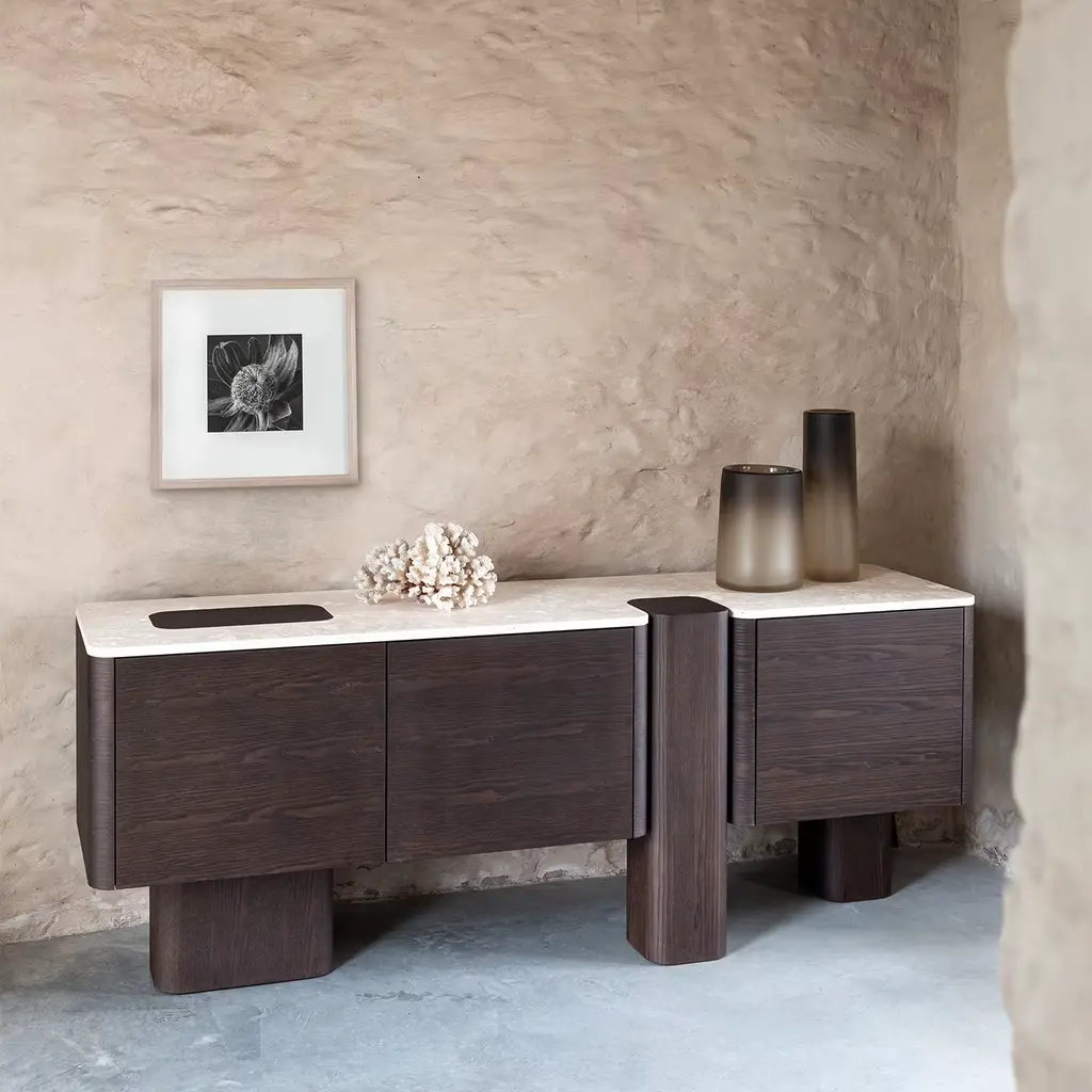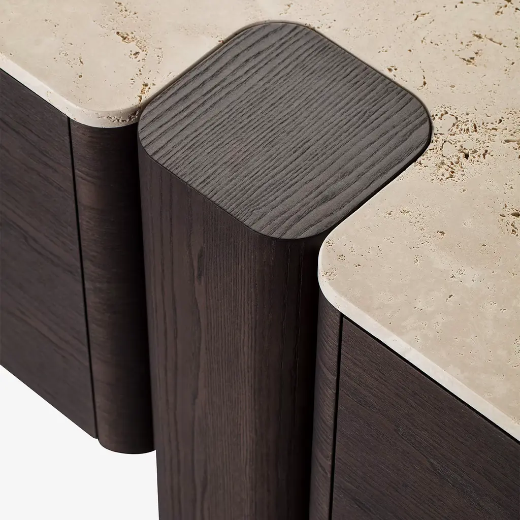 Crafted from solid wood with a marble top, it draws inspiration from cyclopean walls through its interlocking geometric design. The layered materials create a dynamic silhouette, while the monolithic legs and generous proportions lend it a striking, sculptural presence. Customization is available, please contact the concierge for more information.