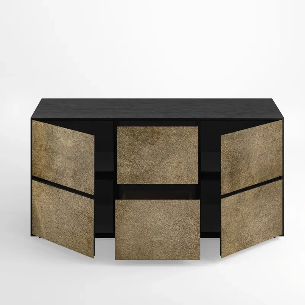 Clean lines and precious surfaces highlight the Eporedia collection's maximal minimalist approach to postmodern design. This collection's use of cast aluminum is a product of the experience of highly skilled Italian artisans whose craft brings depth, dimension, and richness to metal surfaces. Each piece in the Eporedia collection is defined by the slender profile of its open grain oak finished cases, which shroud drawers that are faceted in cast aluminum.