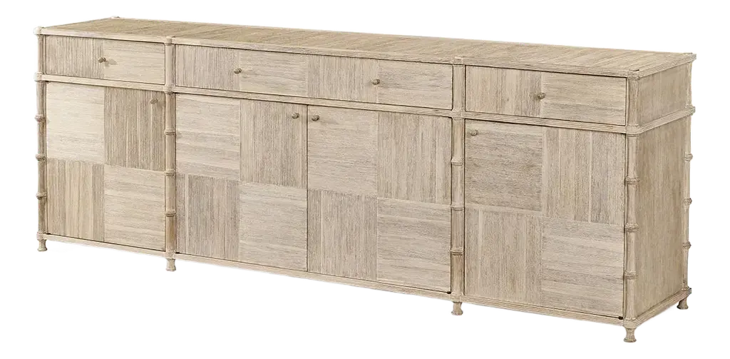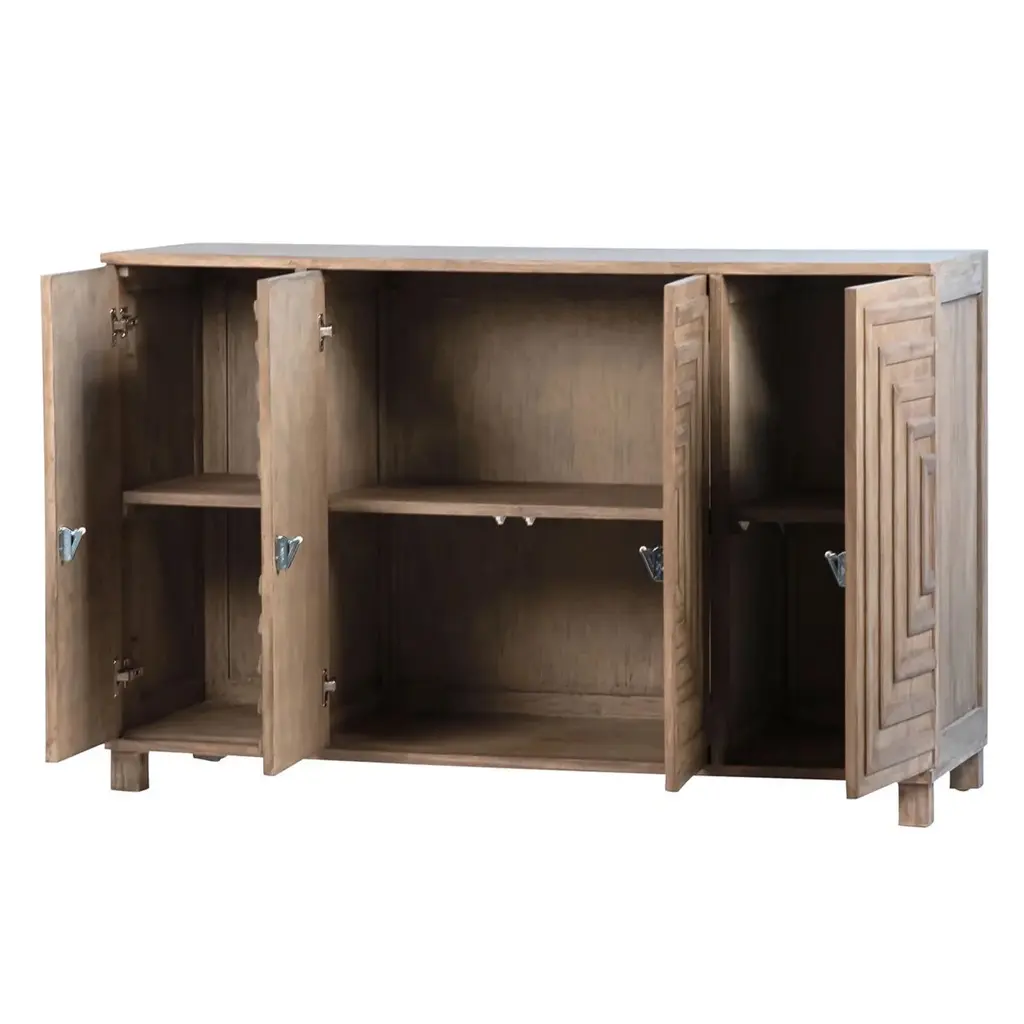 Unique carved wood sideboard with reflecting square pattern on four doors. Outer doors open to smaller areas while two middle doors open to larger cabinet space. Each cabinet will have variations in natural wood tones, grain, and imperfections. This piece weighs approx. 115 lbs.
