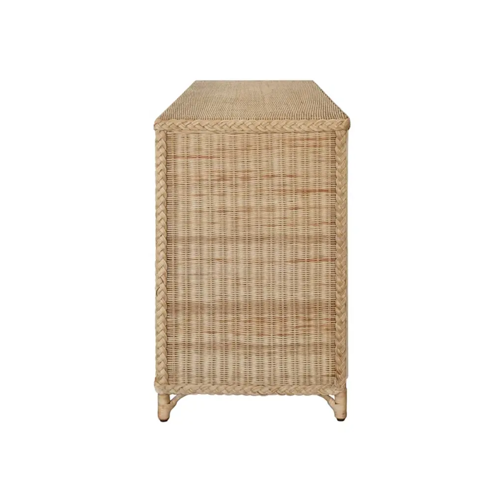 Our Bar Harbor collection combines our love for traditional silhouettes with natural materials to bring you a collection that feels effortlessly sophisticated. It features hand-woven saguran raffia, a sturdy yet delicate-looking material with a unique and gorgeous texture. The raffia is meticulously wrapped over solid wood and is adorned with beautiful brass ring pulls. The 70†Sideboard features four doors that open to a fixed shelf and offers ample storage in your dining room or living room space.