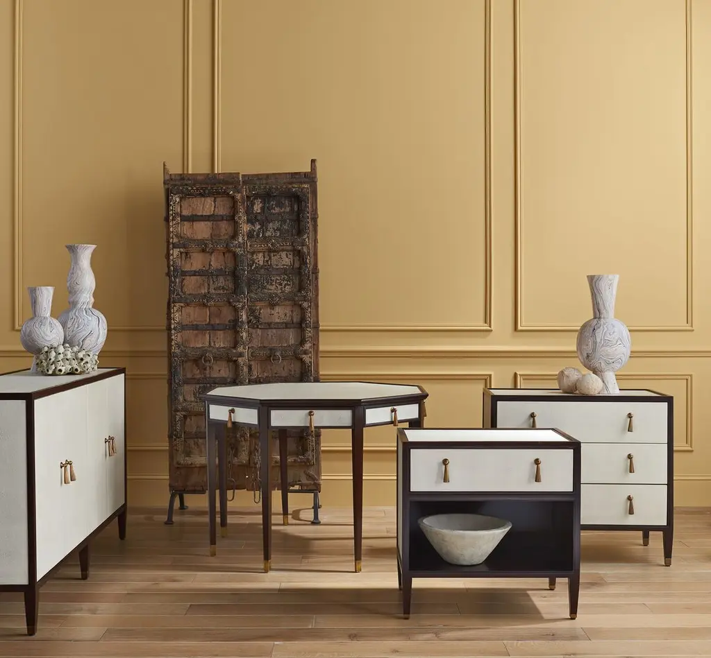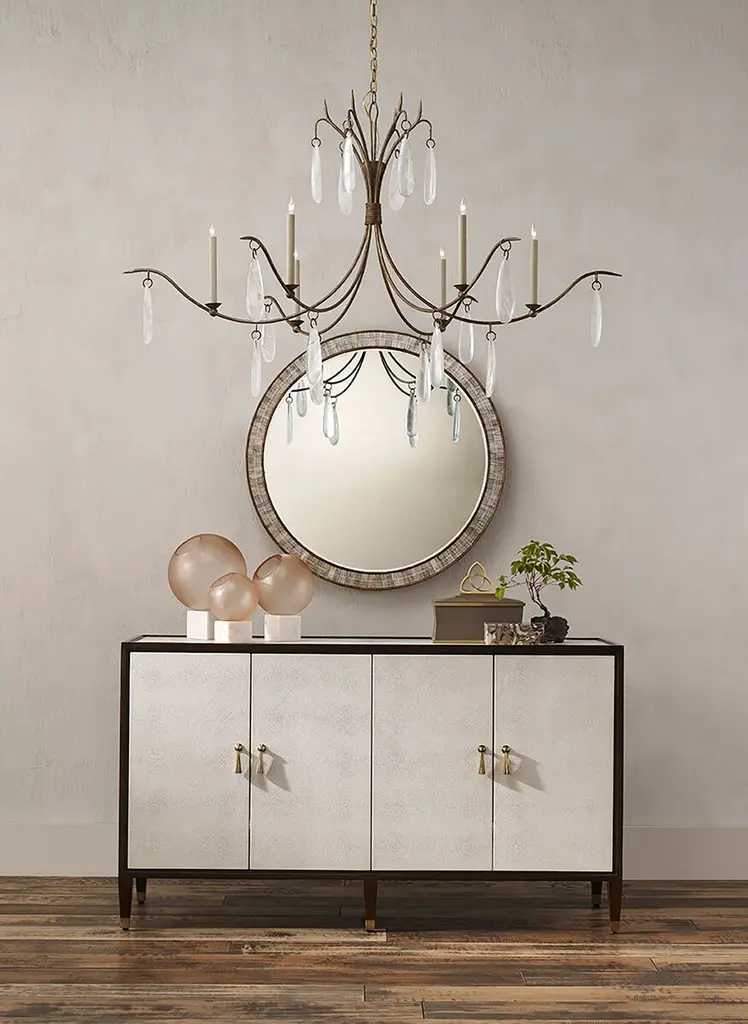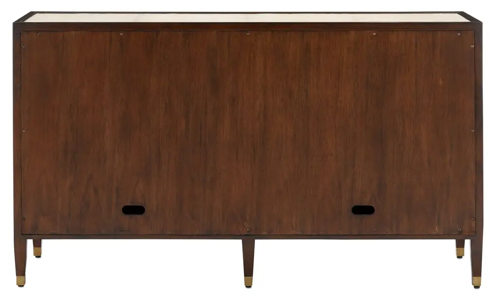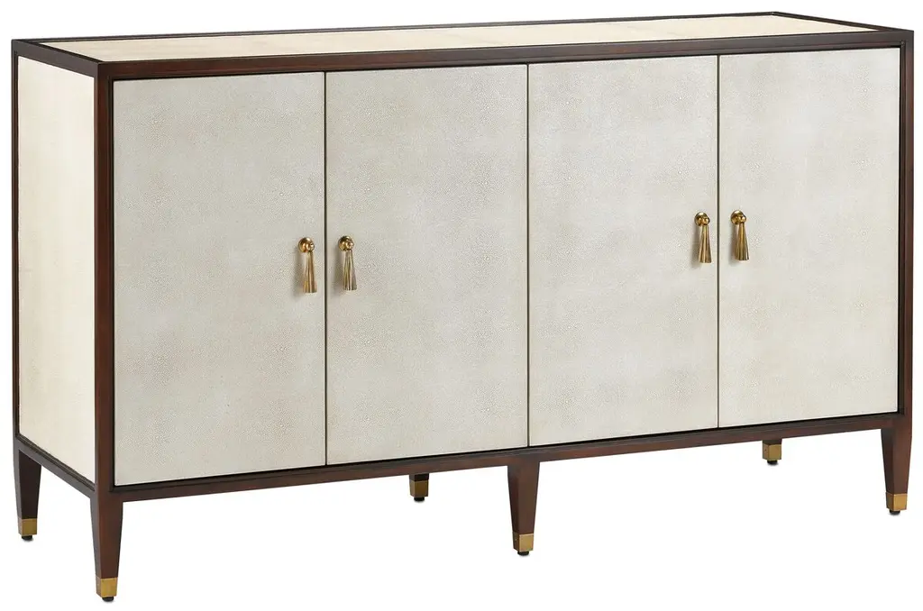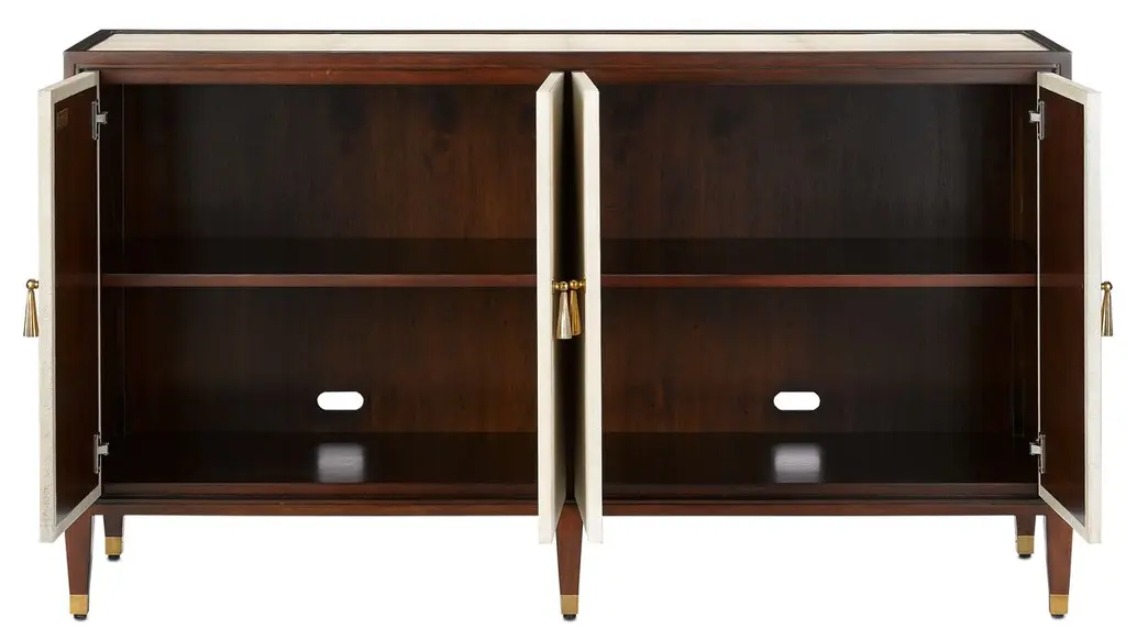 This Deco-inspired credenza is made of mahogany, a hardwood as beautiful as it is durable. The ivory faux shagreen of the door fronts and panels provides a dramatic contrast to the dark finish of the wood. Brass pulls designed to resemble tassels and brass ferrules heighten the glamour. Behind the doors are two adjustable shelves and two cutouts for cord management. Adjustable glides protect your floors.