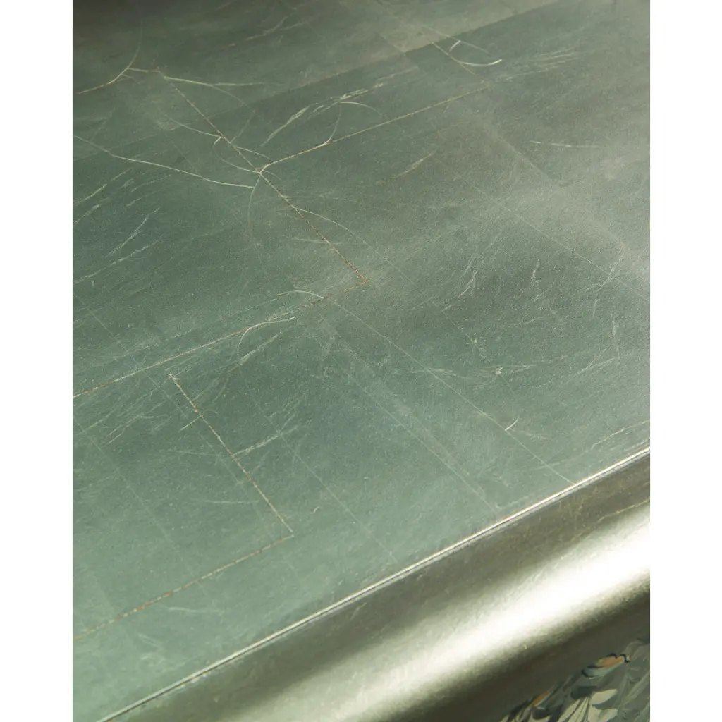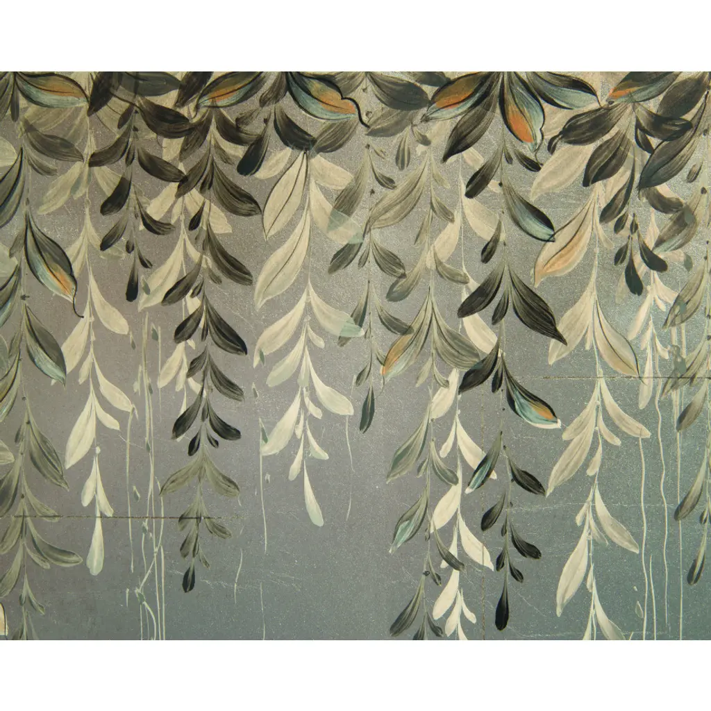 Falling vines are hand-painted over the misto silver leaf on the four doors. The moldings and legs are finished in a contrasting tone. The interior has one adjustable shelf in each cupboard.
