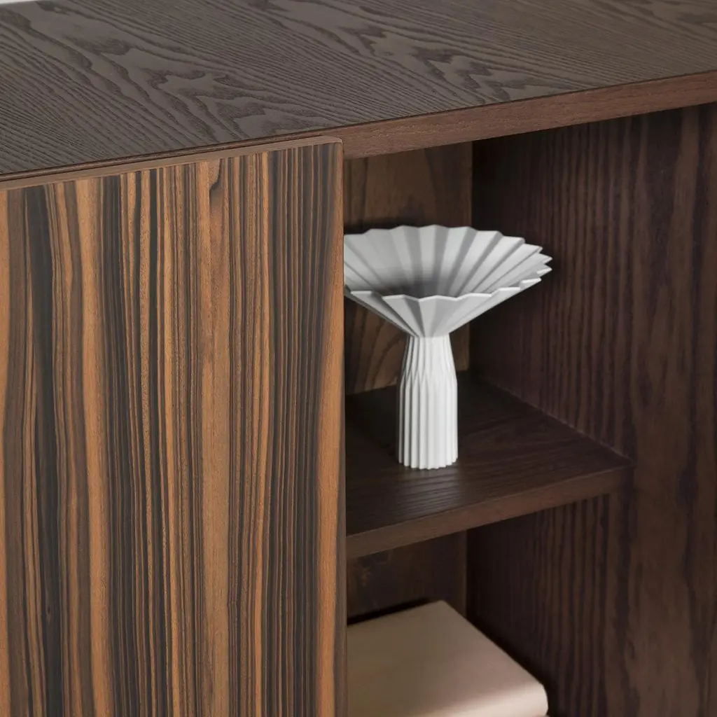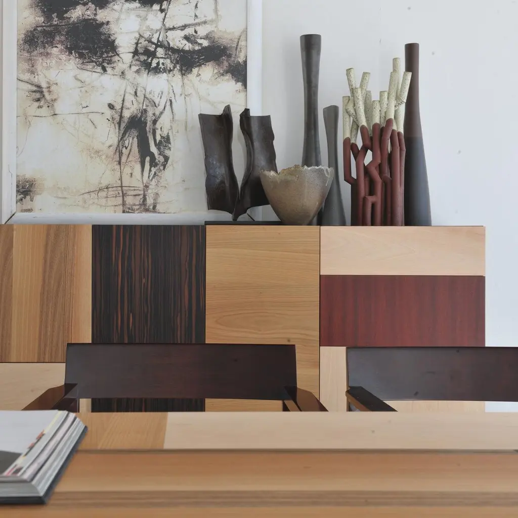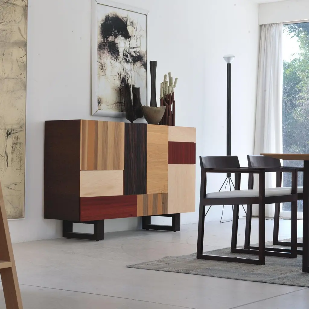 The Patchwork collection designed by Maurizio Duranti for Morelato is intended as a collection able to express the concept of modern furniture but at the same time remaining in the field of skillful cabinet making. The sideboard is made of wengé wood with internal ashwood shelves. It is composed of four doors and two drawers veneered with essences of Makassar ebony, walnut, maple, cherry and padouk. The feet are in solid wengé and are also available in two different heights. In the Patchwork Collection, small pieces of wood are used in the same way in which offcuts and scraps of wool and fabrics are used to make fabric and blankets. In cabinet making Patchwork stands for the use of small pieces of different wood kinds, which exalt each other in elegant combinations. Duranti has used this technique to create drawers, doors, cabinet doors, flaps and unpredictable openings, which Morelato turned into unique pieces of sideboards, tables, coffee tables and bookcases that will be highlights in different home styles and cultures.