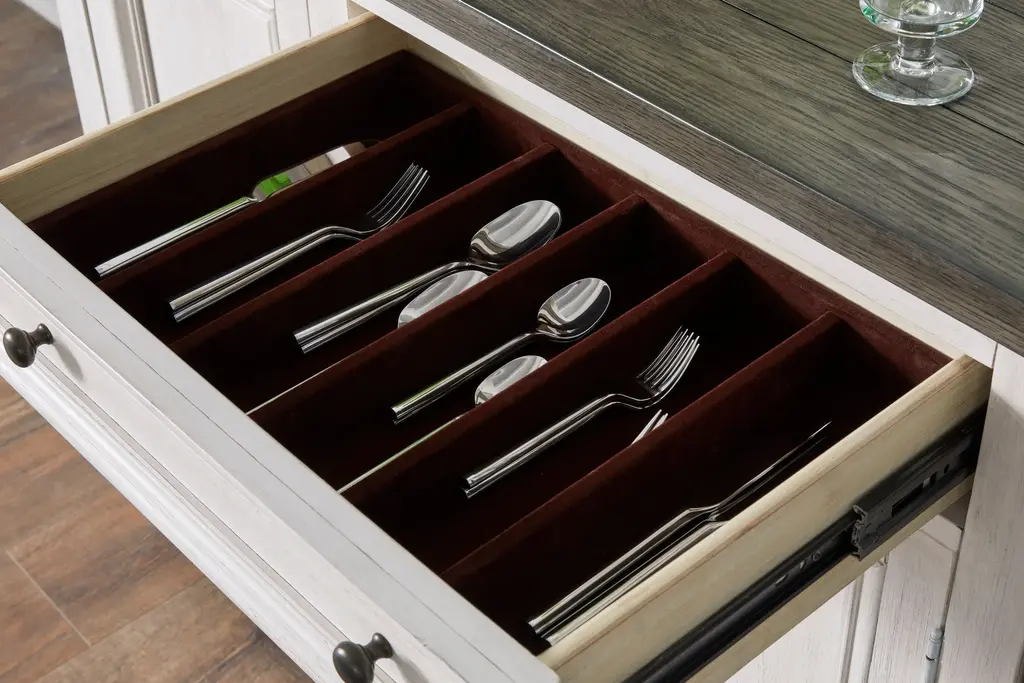 Transform your dining space with a farmhouse sideboard that embodies both beauty and functionality. Crafted with meticulous attention to detail, this piece exudes timeless charm while concealing modern conveniences. Inside, adjustable shelves adapt effortlessly to your storage needs. A discreet felt-lined silverware tray ensures your precious dining essentials are kept safe and organized. Plus, hidden AC outlets provide a seamless blend of form and function, making it a must-have addition to any farmhouse-inspired home.