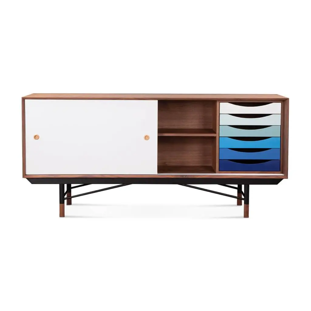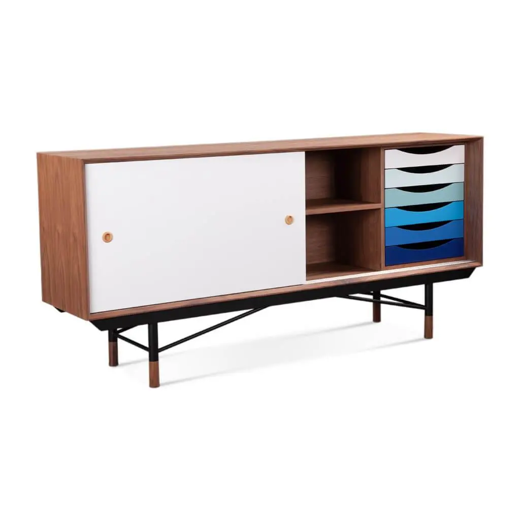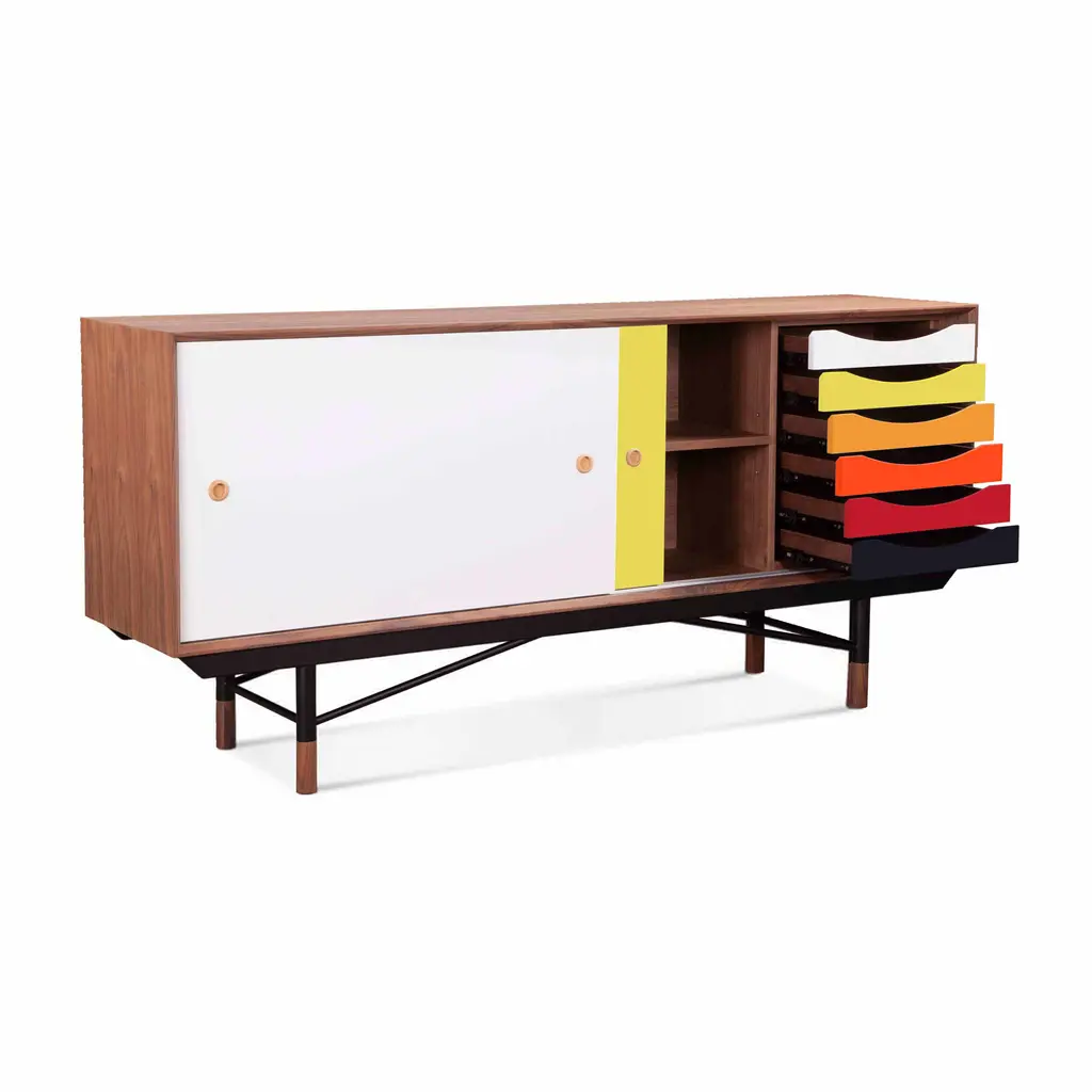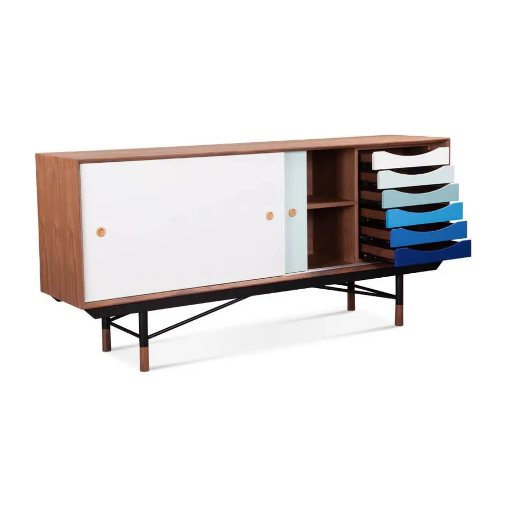A beautifully simple sideboard that brings together elements of wood, steel, and colors from the Geotehe's color wheel. This Finn Juhl credenza can be closed to contain items as well as left playfully open to reveal the beautiful color array of the drawers. Can also serve as a TV stand, media console table, or buffet.