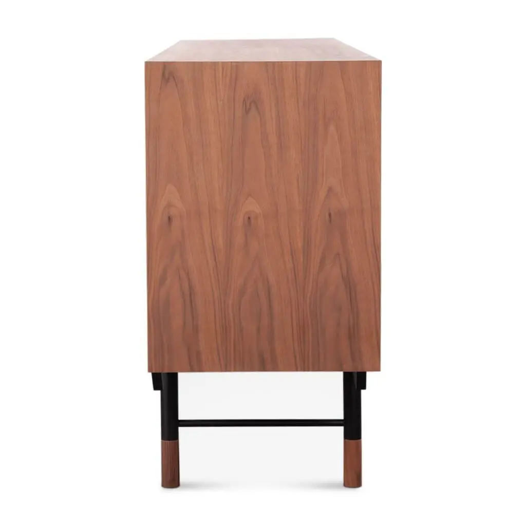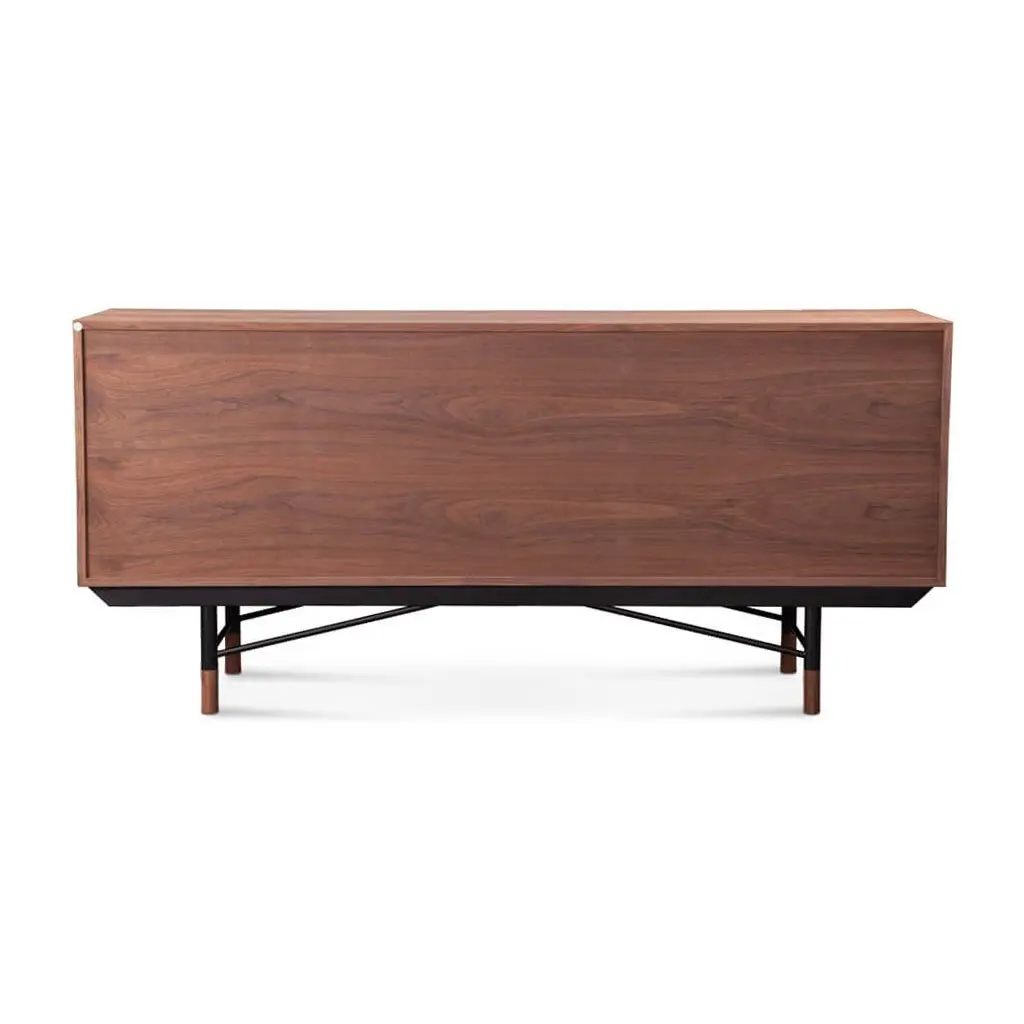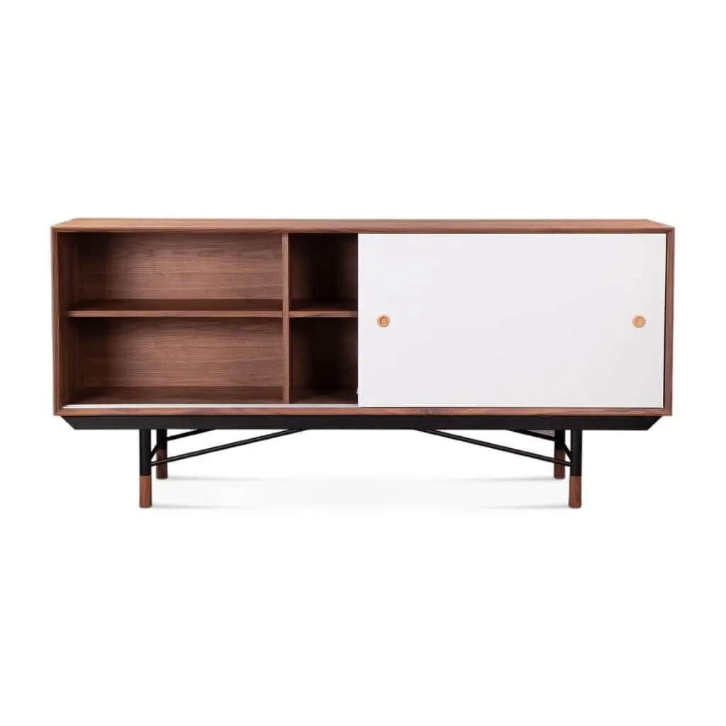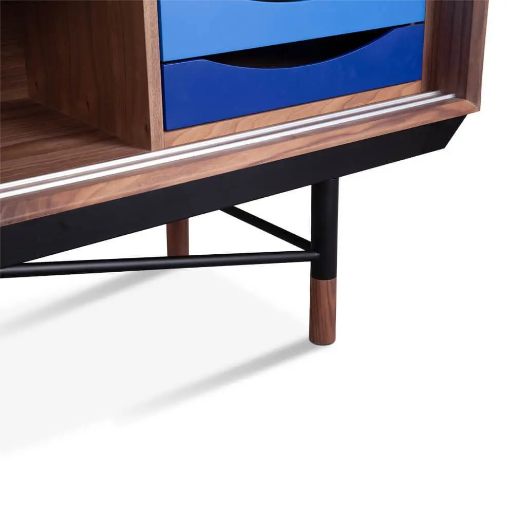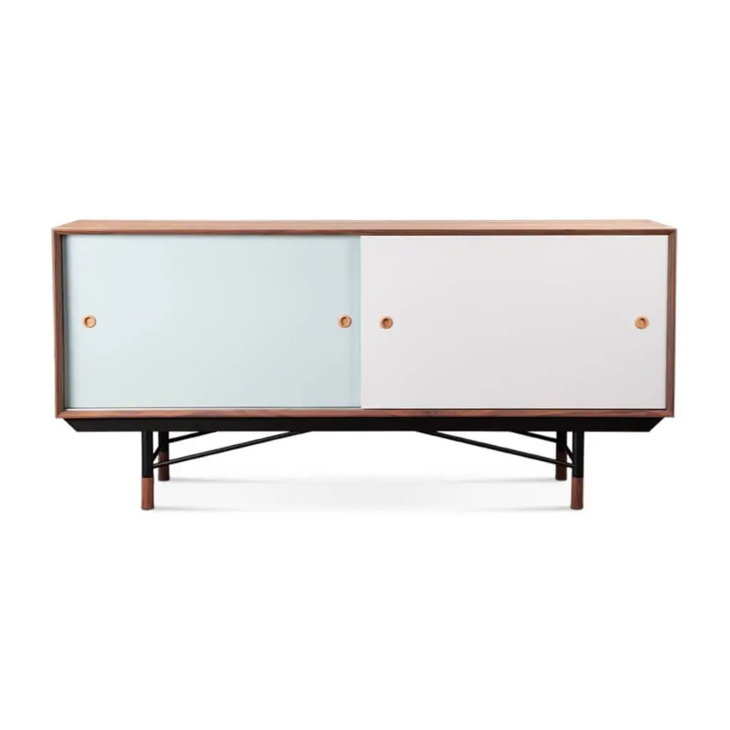 A beautifully simple sideboard that brings together elements of wood, steel, and colors from the Geotehe's color wheel. This Finn Juhl credenza can be closed to contain items as well as left playfully open to reveal the beautiful color array of the drawers. Can also serve as a TV stand, media console table, or buffet.
