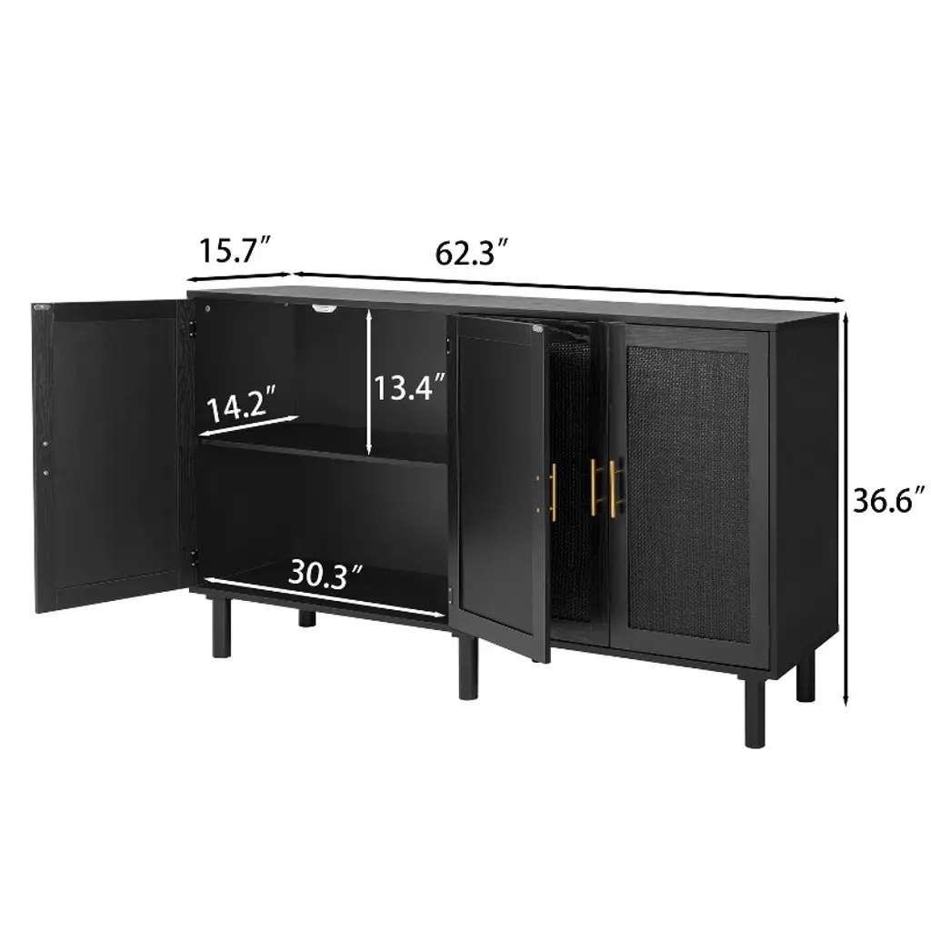 Finnhomy 4 Door Sideboard Buffet Cabinet, Kitchen Storage Cabinet with Black Painted Rattan Decorated Doors, Cupboard Console Table, Boho Accent Liquor Cabinet, 62.3X 15.7X 34.6 Inches, Full Black