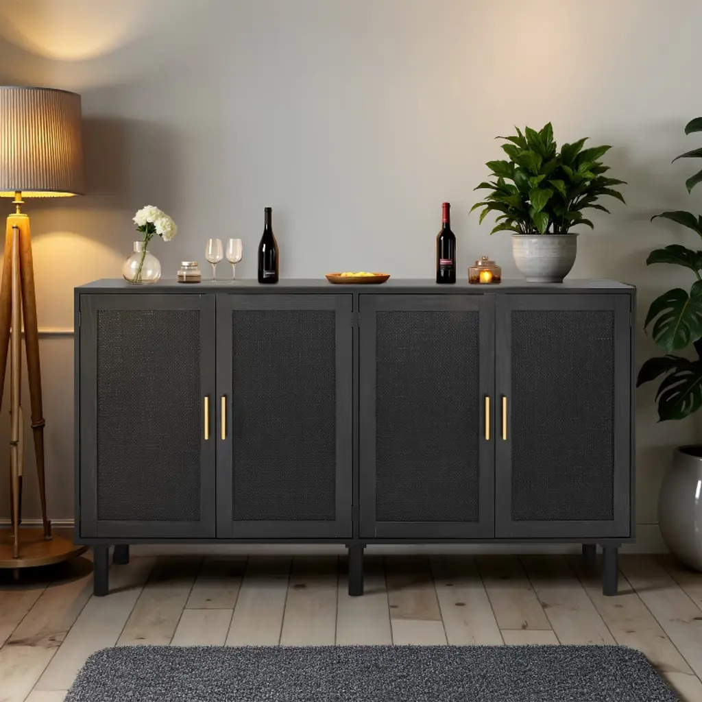 Finnhomy 4 Door Sideboard Buffet Cabinet, Kitchen Storage Cabinet With Rattan Doors, Cupboard Console Table, Boho Accent Liquor Cabinet, Full Black