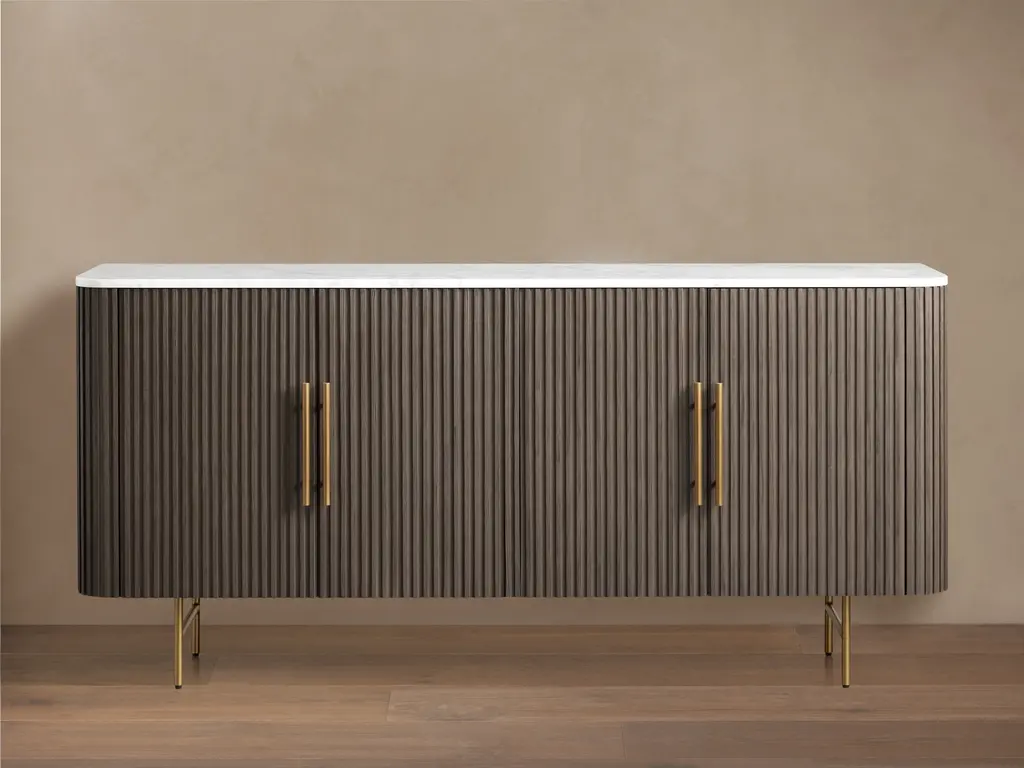 Our Finnley Collection showcases a stunning mixed-material design, inviting elevated style into your dining space. Hand-finished pine from Finland or white oak wood is luxuriously complemented by a stone top, accented by brass hardware and reeded oak detailing. The result is an eclectic-yet-chic collection perfect for gatherings that linger long into the night.