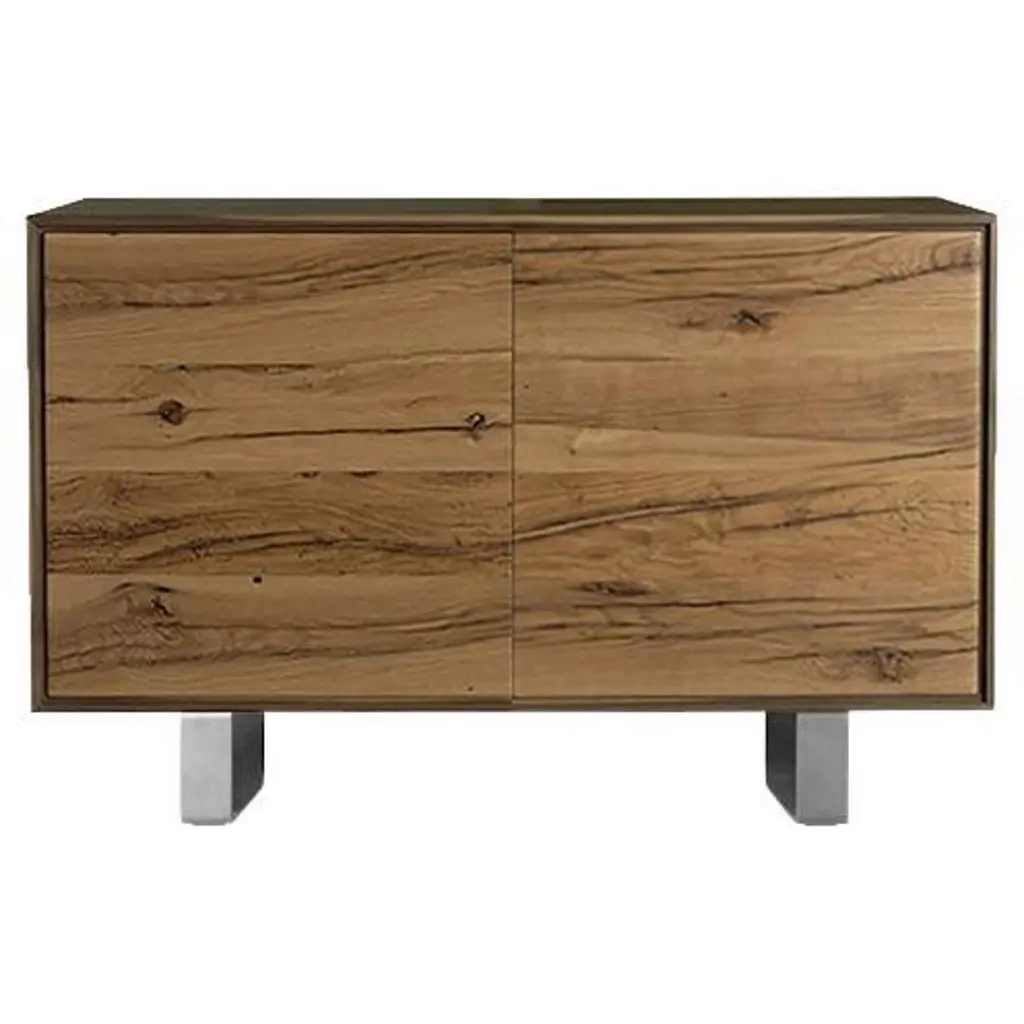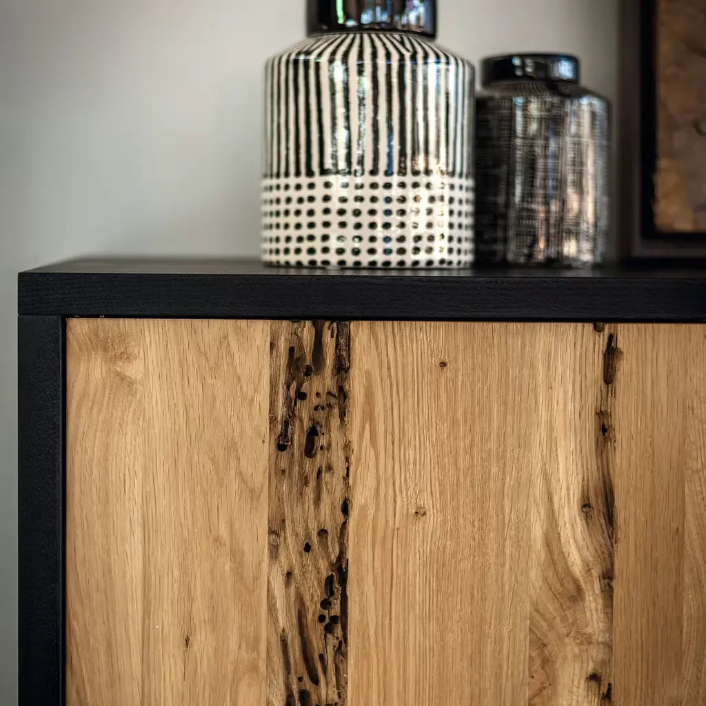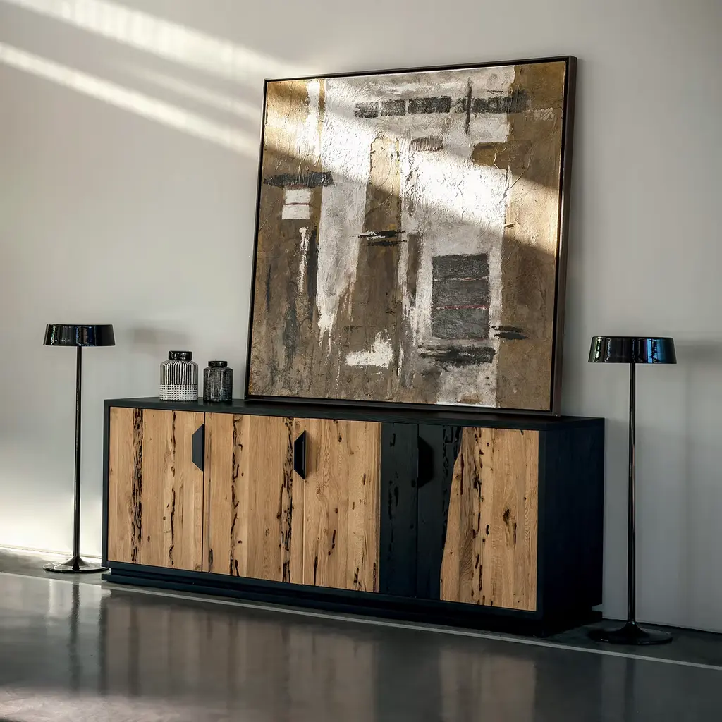 This stunning sideboard combines a black-stained durmast structure with doors in precious waxed briccola - the same wood the poles in the Venetian lagoon are made of. Marked by unrepeatable and unpredictable holes and swirls, the doors sport an entirely unique look perfect for complementing rustic decors. Trapezoid-shaped iron handles lacquered in dark gray (RAL 7021) complete the design.