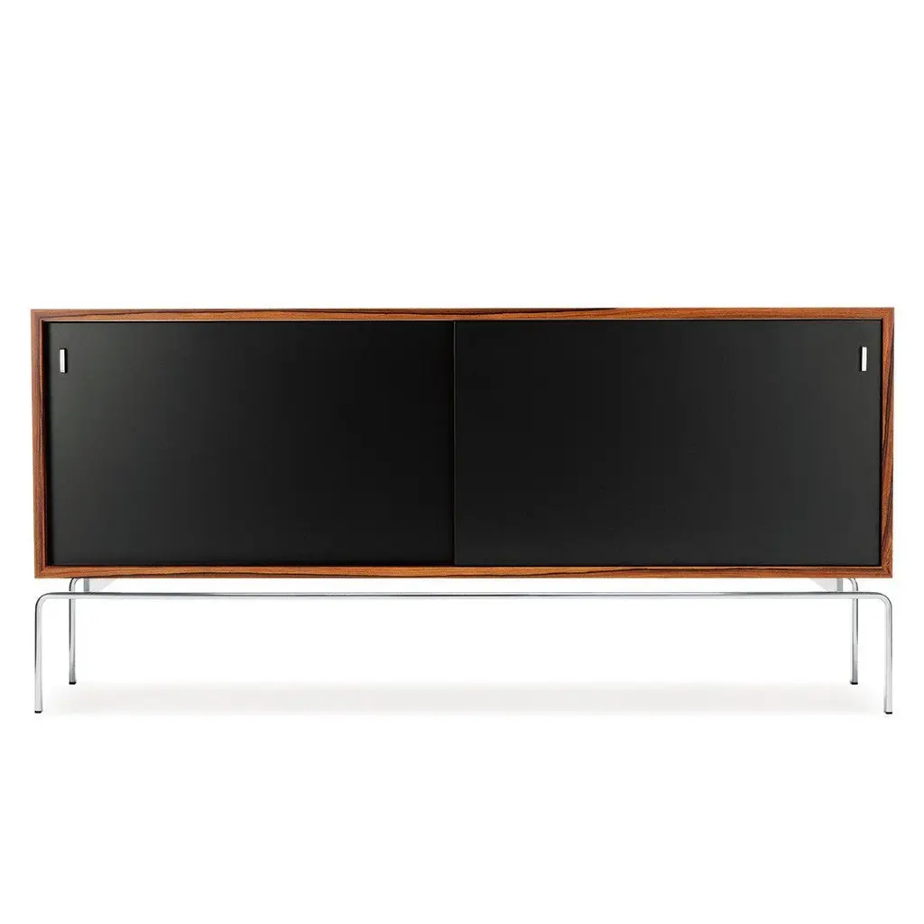 The FK 150 Sideboard was designed in 1973 by Jorgen Kastholm and is today being produced at the same factory, on the same tools as back in the seventies.The sideboard is a perfect room divider as it is veneered on all surfaces on the outside as well as on the inside. It is made in an outstanding quality where the details speak for themselves. Cabinet of veneer with frame in chrome-plated steel. The cabinet is available in dark oak with doors in dar oak, santos palisander with black doors and Olive wood with white doors. Smoked oak The characteristic feature of smoked oak are bright lines crossing the dark brown wood surface. An elaborate smoking process gives the oak its dark colour and rick and elegant appearance. the typical oak characteristics of fine age rings and expressive pore structure are maintained. Olive tree The olive tree is one of the oldest crops cultivated in the Old World and is wide-spread through the Mediterranean region. it is an extremely decorative wood. Its typical strong lines create beautiful effect on large surfaces. Because of the short and gnarly growth of the olive tree, veneer size of more than 1 meter are rare, traditionally this wood is also used in the making of art object. Santos Palisander Santos rosewood comes from South America and was originally meant to replace the endangered rio variety. today this noble precious wood has consolidated its market position as decorative furniture wood. the varied grain making of Santos rosewood accentuate its unusual and playful colour.