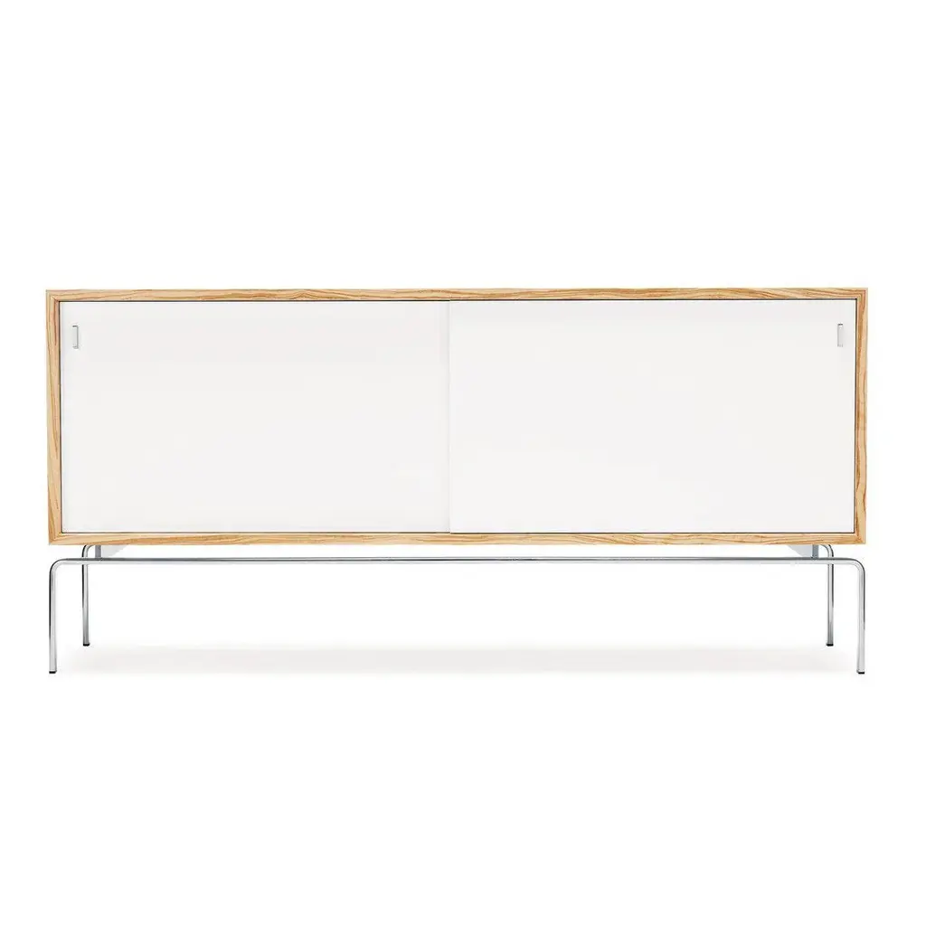 The FK 150 Sideboard was designed in 1973 by Jorgen Kastholm and is today being produced at the same factory, on the same tools as back in the seventies.The sideboard is a perfect room divider as it is veneered on all surfaces on the outside as well as on the inside. It is made in an outstanding quality where the details speak for themselves. Cabinet of veneer with frame in chrome-plated steel. The cabinet is available in dark oak with doors in dar oak, santos palisander with black doors and Olive wood with white doors. Smoked oak The characteristic feature of smoked oak are bright lines crossing the dark brown wood surface. An elaborate smoking process gives the oak its dark colour and rick and elegant appearance. the typical oak characteristics of fine age rings and expressive pore structure are maintained. Olive tree The olive tree is one of the oldest crops cultivated in the Old World and is wide-spread through the Mediterranean region. it is an extremely decorative wood. Its typical strong lines create beautiful effect on large surfaces. Because of the short and gnarly growth of the olive tree, veneer size of more than 1 meter are rare, traditionally this wood is also used in the making of art object. Santos Palisander Santos rosewood comes from South America and was originally meant to replace the endangered rio variety. today this noble precious wood has consolidated its market position as decorative furniture wood. the varied grain making of Santos rosewood accentuate its unusual and playful colour.