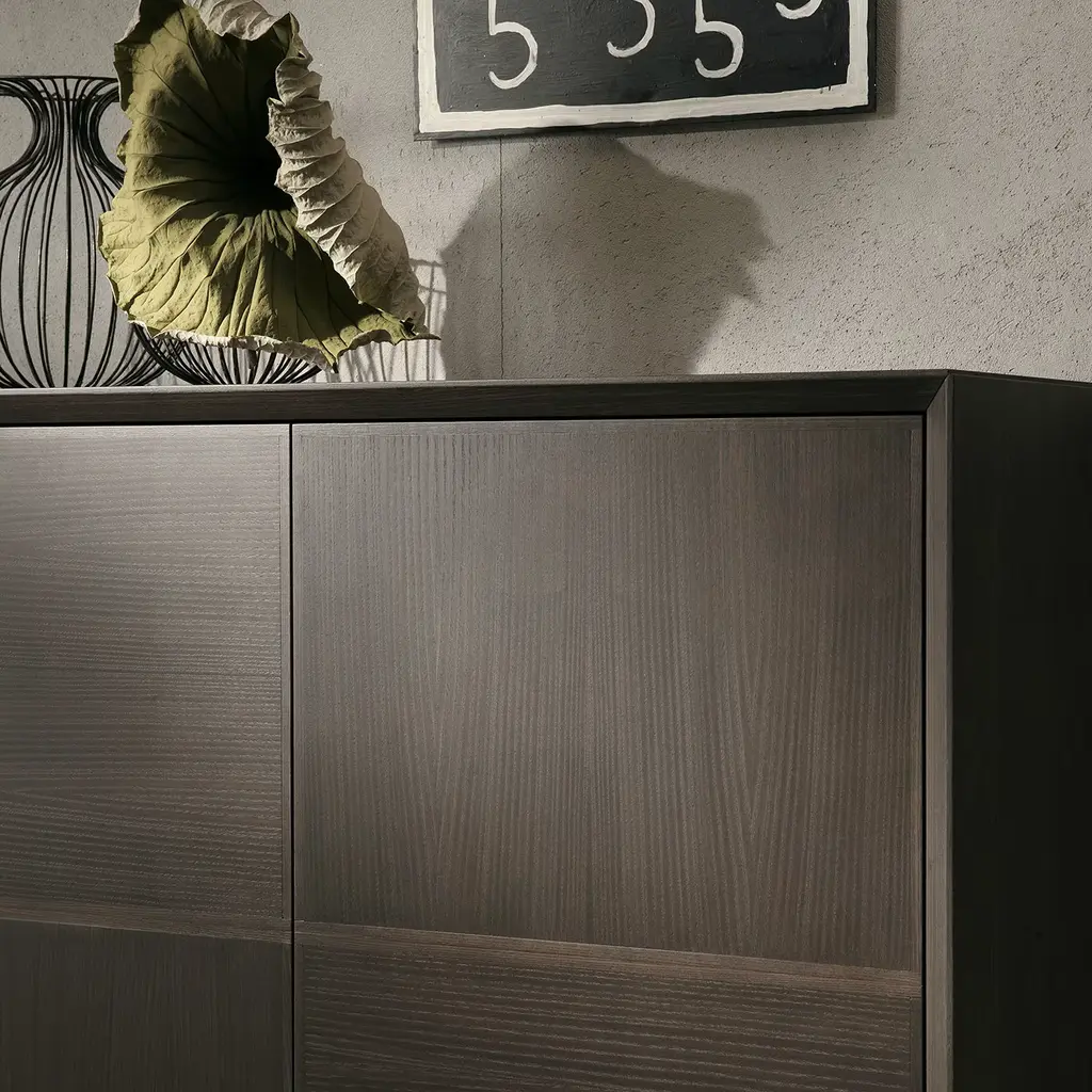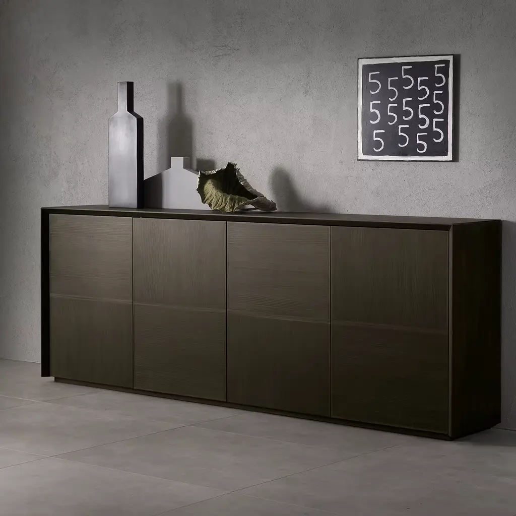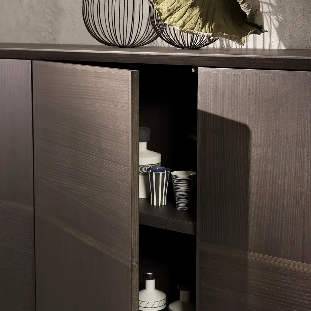 This elegant sideboard was designed by Giuliano Cappelletti and crafted of wood with the exterior veneered in ash and profiles in solid ash. Inside, the versatile storage space is separated by shelves in wood. The front panels create a geometric decoration, suitable for an industrial and contemporary design, where this piece will add precious space and a subtle decorative accent. The wood can be finished in wenge, walnut, black stained and matt lacquered - please ask the Concierge for details and pricing.