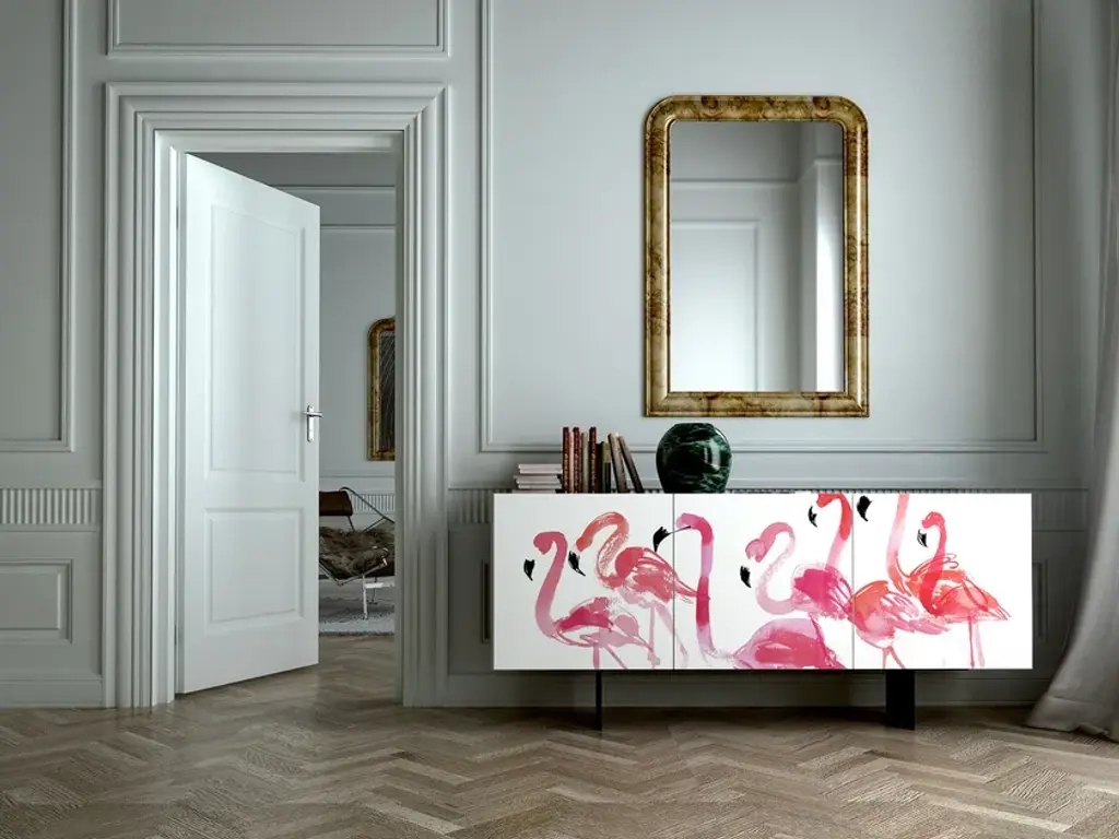 Sideboard with three doors in lacquered wood inside. The exterior is made of digital printing with protective paint. The container is supplied with a metal pedestal.